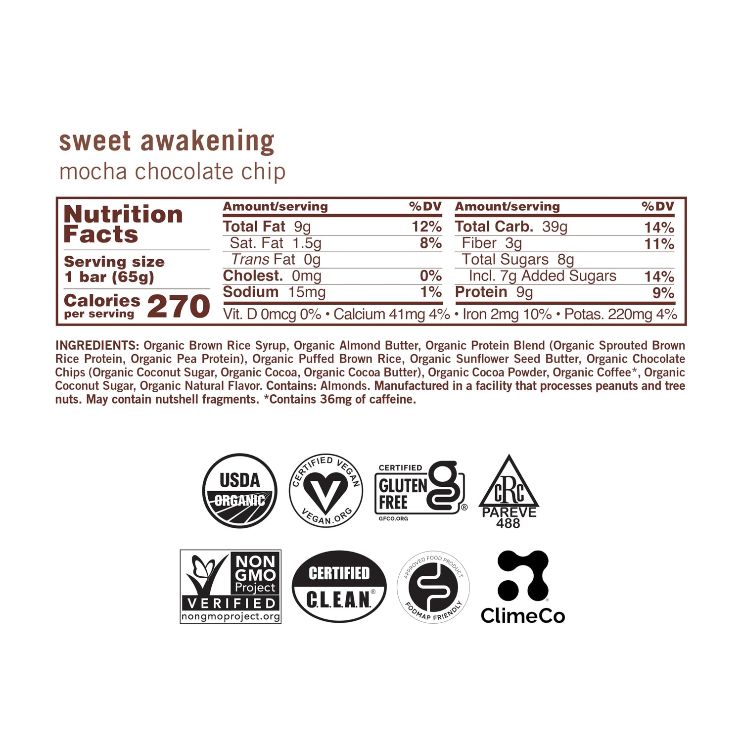 Details: You can skip the second cup with our Mocha Chocolate Chip MacroBar. Each bar contains 36 mg of caffeine, slightly less than half of a standard cup of coffee. Like all of our plant-based protein bars, Sweet Awakening is Certified Organic, Vegan, Gluten-Free, Kosher, Non-GMO, C.L.E.A.N., FODMAP Friendly, and Soy-Free.