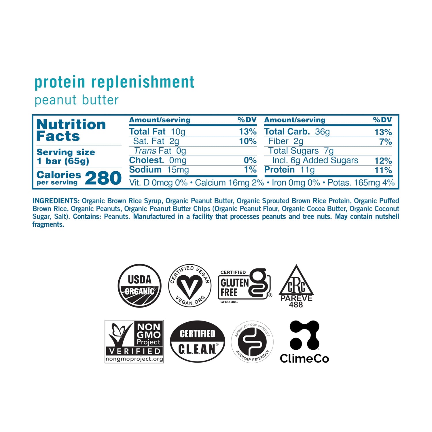 Details: Our Protein Replenishment MacroBar is a peanut butter lover’s dream! Crunchy peanuts complement our very own melt-in-your-mouth vegan peanut butter chips for a celebration of the salty and sweet combination we all know and love. Like all of our plant-based protein bars, Protein Replenishment is Certified Organic, Vegan, Gluten-Free, Kosher, Non-GMO, C.L.E.A.N., FODMAP Friendly, and Soy-Free.