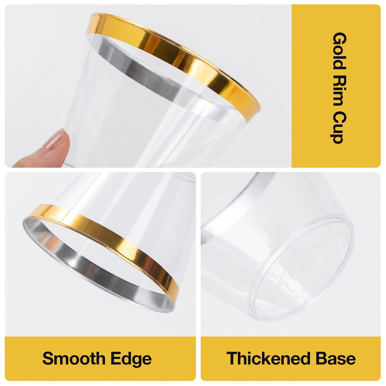 - What's You Get - Each package includes 200pcs 9 oz gold rim and clear plastic cups disposable, so you'll have plenty to go around. Please note that plastic cups are intended for room temperature or cold beverages only.