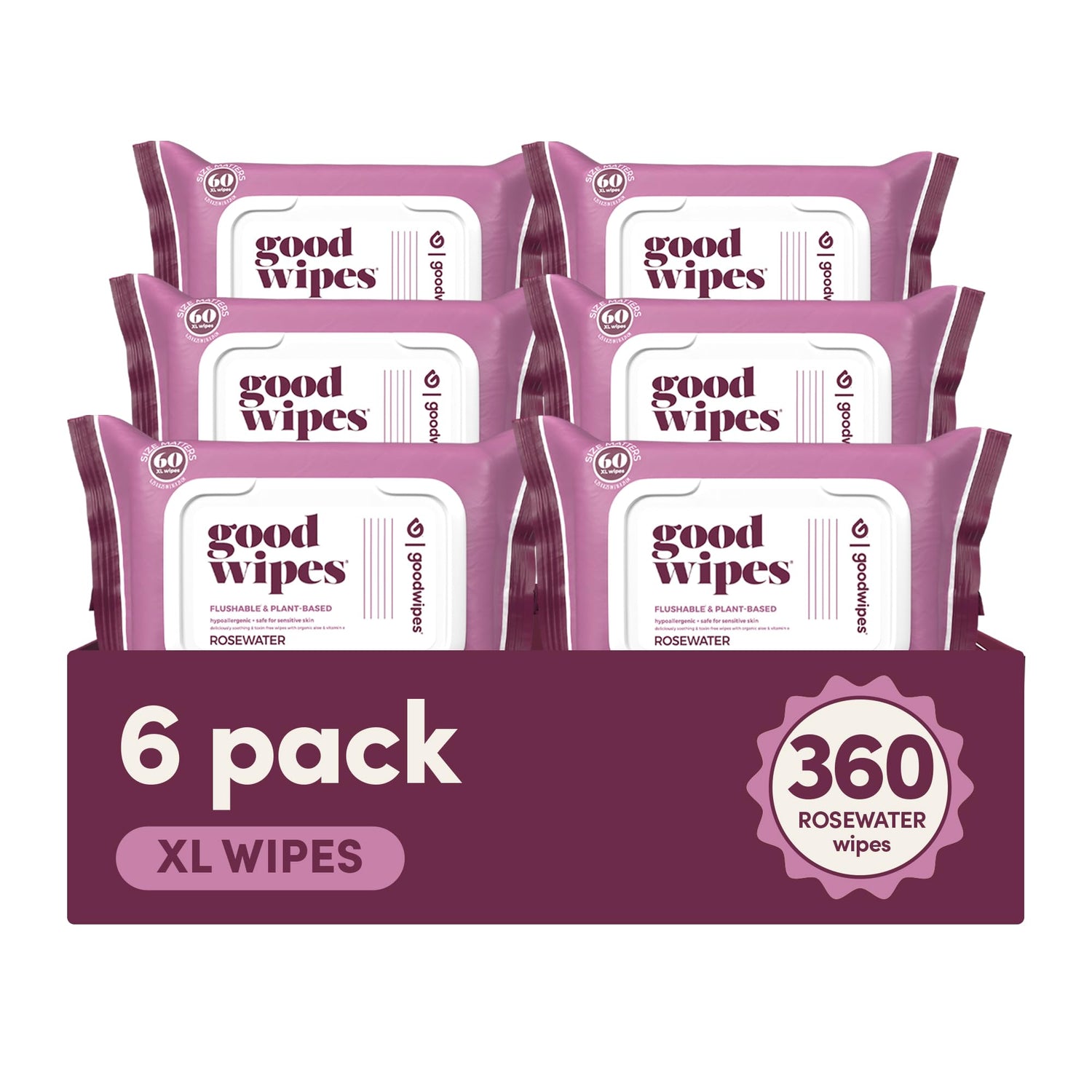 Goodwipes Flushable Butt Wipes Made with Vitamin E & Aloe - Soft & Gentle Wet Wipe Dispenser for Home Use, Septic & Sewer Safe - Largest Adult Toilet Towelettes - Rosewater, 360 Count (6 Packs)