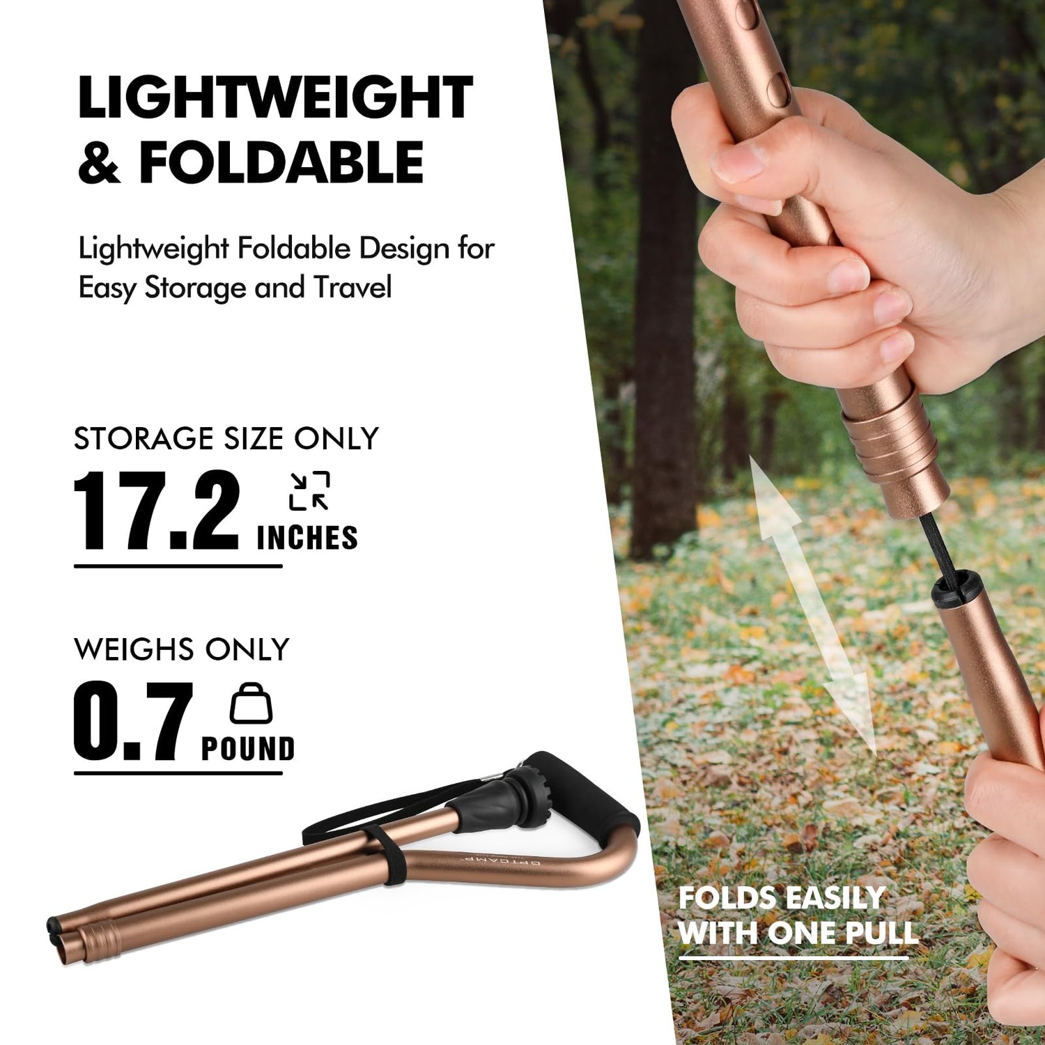 - Foldable and Compact Walking Cane: Compact and retractable bi-fold design, can be folded to 17.32" portable cane. Easy to store and easy to carry, easy to fit into backpacks, duffel bags and wheelchair bags. collapsible cane will bring convenience to the elderly and injured people out.