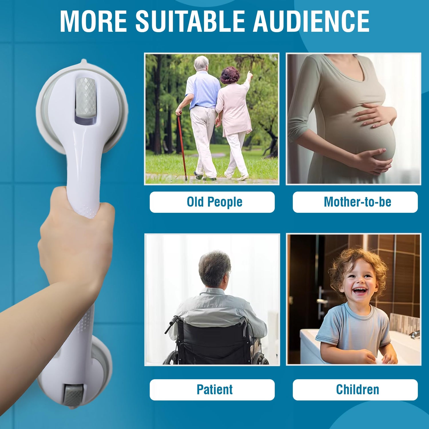 - VERSATILE USE: The shower suction grab bar can be used by seniors, elderly, pregnant women, kids, injured, recovering or handicapped people needing assistance in the bathroom or shower. Easy to install and secure, the grab bar can also be used in the toilet, bedroom, or kitchen.