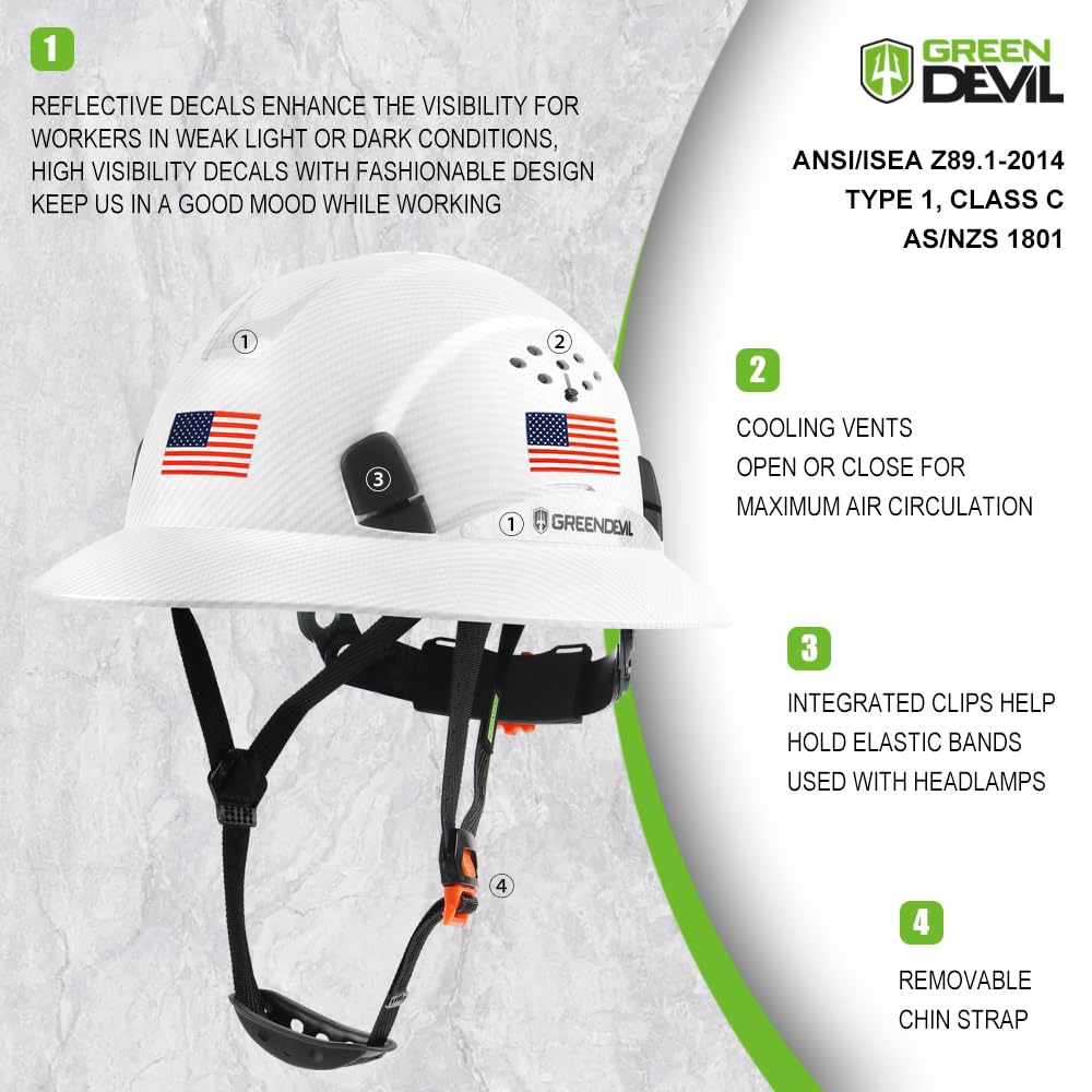 GREEN DEVIL Full Brim Hard Hat Vented Construction Safety Helmet OSHA Approved Cascos De Construccion Work Hardhat for Men&Women 6 Point Adjustable Ratchet Suspension Custom Pattern Design