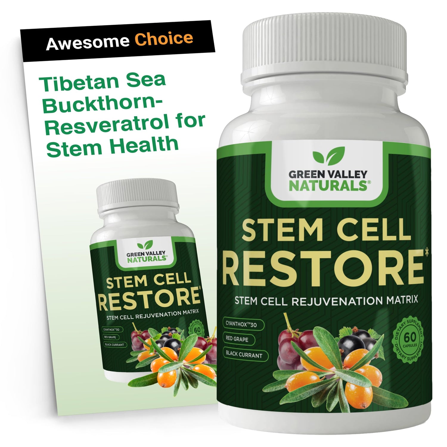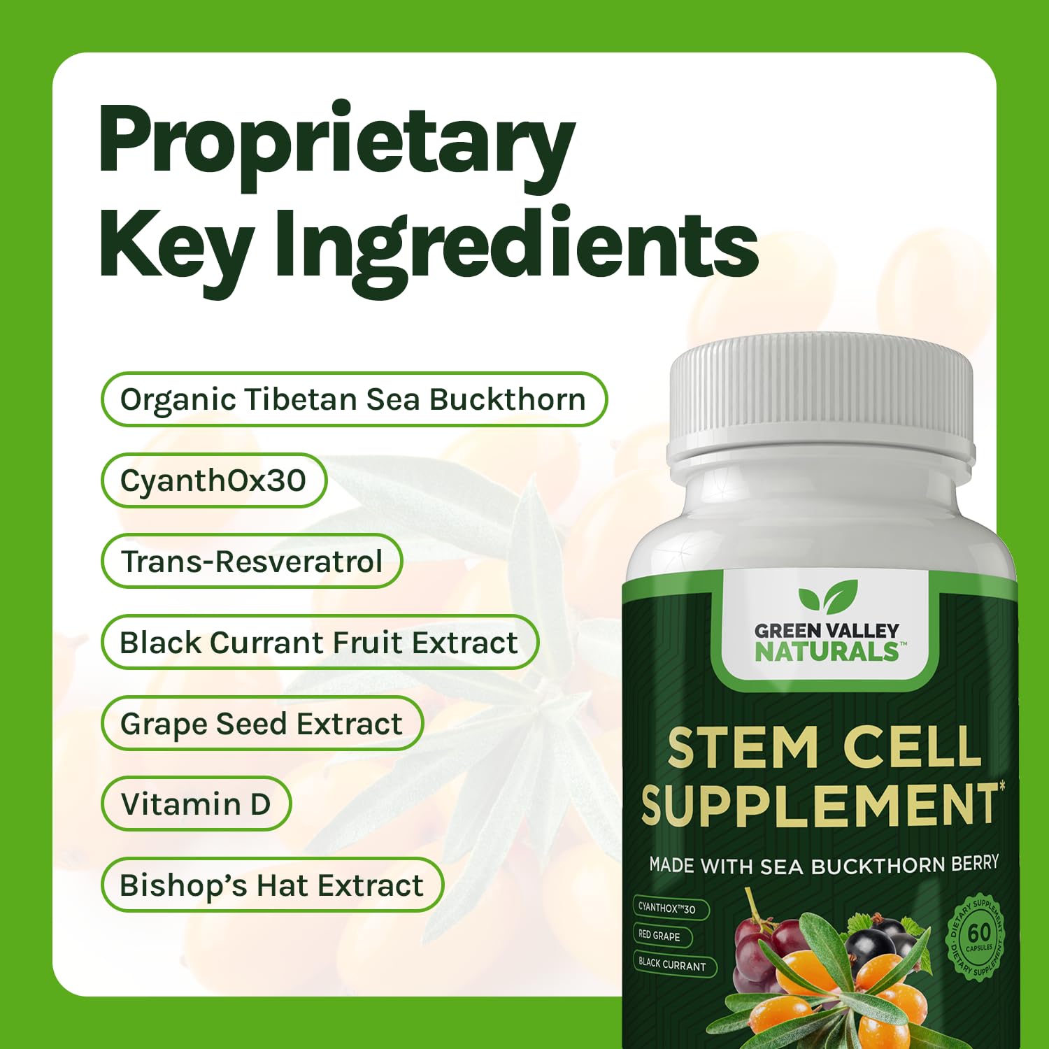 GREEN VALLEY NATURALS Stem Cell Supplement - Organic Tibetan Sea Buckthorn-Resveratrol, Vitamin D, Bishop's Hat Extract (1 Bottle, 60 Count)
