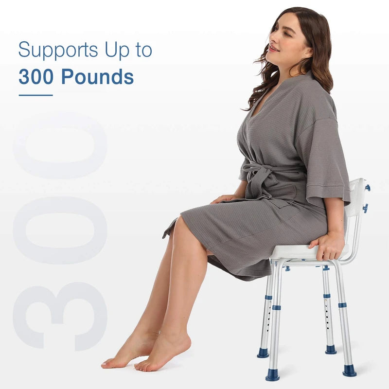 - Secure Durable: Our small shower chairs are constructed with quality corrosion-resistant aluminum frame, the senior shower seat frame supports up to 300 pounds.