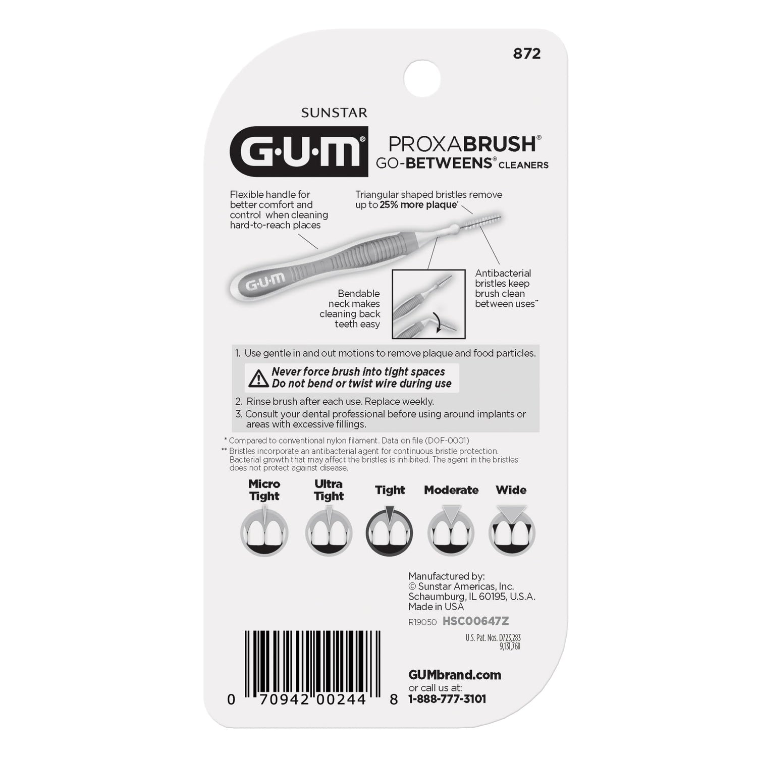 Details: Go beyond brushing with GUM Proxabrush Go-Betweens. Between-teeth cleaning is essential for removing plaque from hard-to-reach areas that are missed by brushing alone....But tight teeth, difficulty gripping floss, and a simple lack of time prevent many of us from flossing as often as we should. Proxabrush Go-Betweens Interdental Cleaners are clinically designed by dental professionals to offer a quick, easy, and effective alternative to flossing. Our Tight reusable floss brushes are specifically made to remove plaque and food particles from tighter interdental spaces, the perfect braces cleaner. Each floss brush features coated bristles and a breathable travel cap that allows for up to ten days of use. With GUM Proxabrush Go-Betweens, cleaning the hard-to-reach areas in your mouth has never been easier. A non-slip rubber handle and bendable neck make it easy to maneuver to the back of the mouth while nylon coated wire cleans around braces, bridges, implants, and other dental devices without the risk of scratching or galvanic shock. Features : ● Designed for tight interdental spaces ● Triangular bristles for 25% more effective plaque removal* ● Nylon coated wire is a perfect braces brush for cleaning. ● Coated bristles and a breathable travel cap allow 10 days of use ● Non-slip rubber handle for easy grip ● Bendable neck for further reach Our dental brushes make it easy to carry a confident smile with you wherever you go. Different from flosser picks, each interdental brush features a compact, portable size that fits easily into purses, pockets, and travel kits for healthier gums, cleaner teeth, and fresher breath anytime, anywhere. *vs DOF-0001