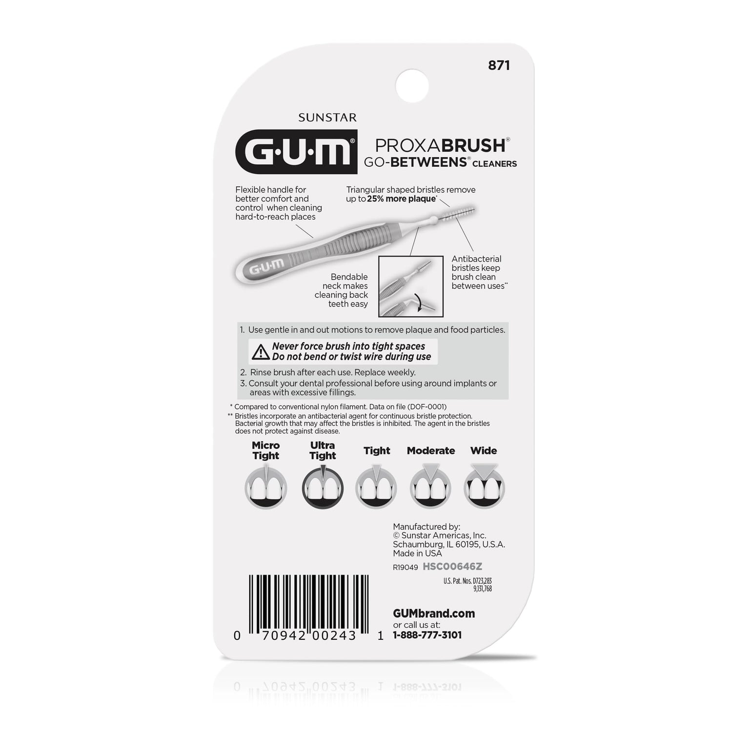 Details: Go beyond brushing with GUM Proxabrush Go-Betweens. Between-teeth cleaning is essential for removing plaque from hard-to-reach areas that are missed by brushing alone....But tight teeth, difficulty gripping floss, and a simple lack of time prevent many of us from flossing as often as we should. Proxabrush Go-Betweens Interdental Cleaners are clinically designed by dental professionals to offer a quick, easy, and effective alternative to flossing. Our Ultra Tight reusable floss brushes are specifically made to remove plaque and food particles from tighter, more narrow interdental spaces, and are the perfect braces cleaner. Each floss brush features coated bristles and a breathable travel cap that allows for up to ten days of use. With GUM Proxabrush Go-Betweens, cleaning the hard-to-reach areas in your mouth has never been easier. A non-slip rubber handle and bendable neck make it easy to maneuver to the back of the mouth while nylon-coated wire cleans around, bridges, implants, and other dental devices without the risk of scratching or galvanic shock. Features : ● Designed for extra tight interdental spaces ● Triangular bristles for 25% more effective plaque removal* ● Nylon coated wire is a perfect braces brush for cleaning. ● Hygienic coated bristles and a breathable travel cap allow 10 days of use ● Non-slip rubber handle for easy grip ● Bendable neck for further reach Our dental brushes make it easy to carry a confident smile with you wherever you go. Different from flosser picks, each interdental brush features a compact, portable size that fits easily into purses, pockets, and travel kits for healthier gums, cleaner teeth, and fresher breath - anytime, anywhere. *vs DOF-0001