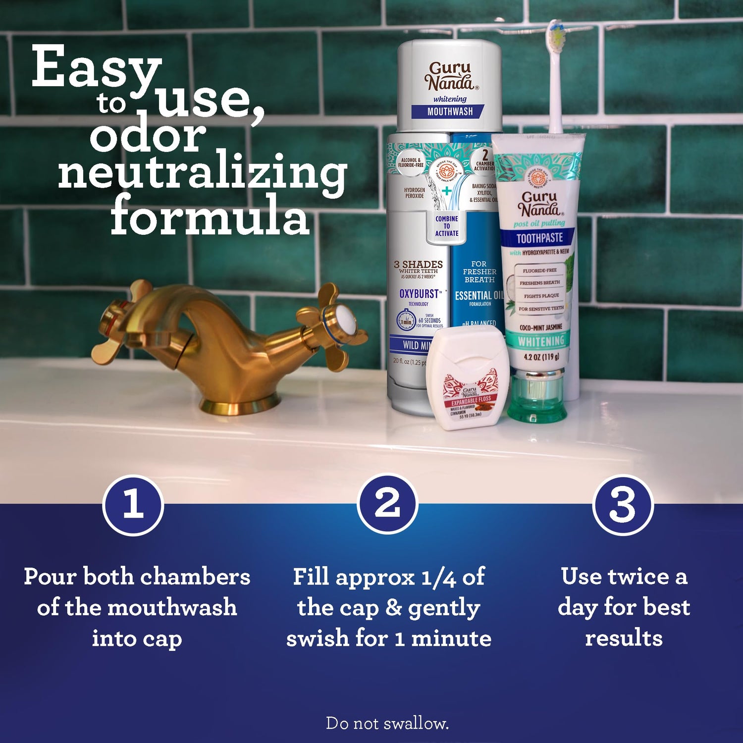 - WHITENING & ORAL CARE INNOVATION: GuruNanda Whitening Mouthwash uses a fluoride-free, dual-chamber formula. One chamber has hydrogen peroxide, while the other holds 7 essential oils, baking soda, and xylitol, creating a pH-balanced solution for a brighter smile.