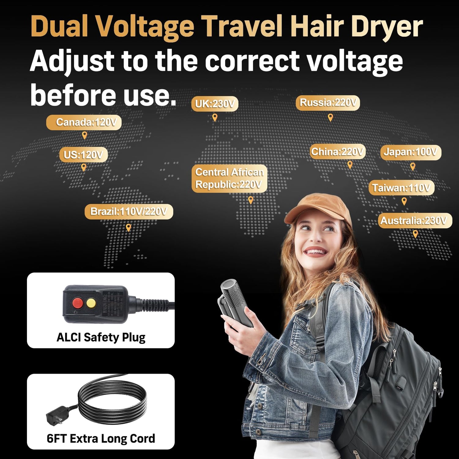 - ใCompact and ๐๐๐ฎ๐น ๐ฉ๐ผ๐น๐๐ฎ๐ด๐ฒ ๐ณ๐ผ๐ฟ Global ๐ง๐ฟ๐ฎ๐๐ฒ๐น-๐๐ฟ๐ถ๐ฒ๐ป๐ฑ๐น๐ ๐จ๐๐ฒใWeighing 1lb, about the same size as your phone, this travel blow dryer features a foldable design thatโs half the size of a typical hair dryer, easy to pack in your travel essentials. It effortlessly fitting into your ๐๐ฟ๐ฎ๐๐ฒ๐น essentials. With the ๐๐๐ฎ๐น ๐ฉ๐ผ๐น๐๐ฎ๐ด๐ฒ range ๐ญ๐ฎ๐ฌ๐ฉ ๐๐ผ ๐ฎ๐ฐ๐ฌ๐ฉ, it can detect local voltage and adjust to the correct voltage automatically, perfect for global use.