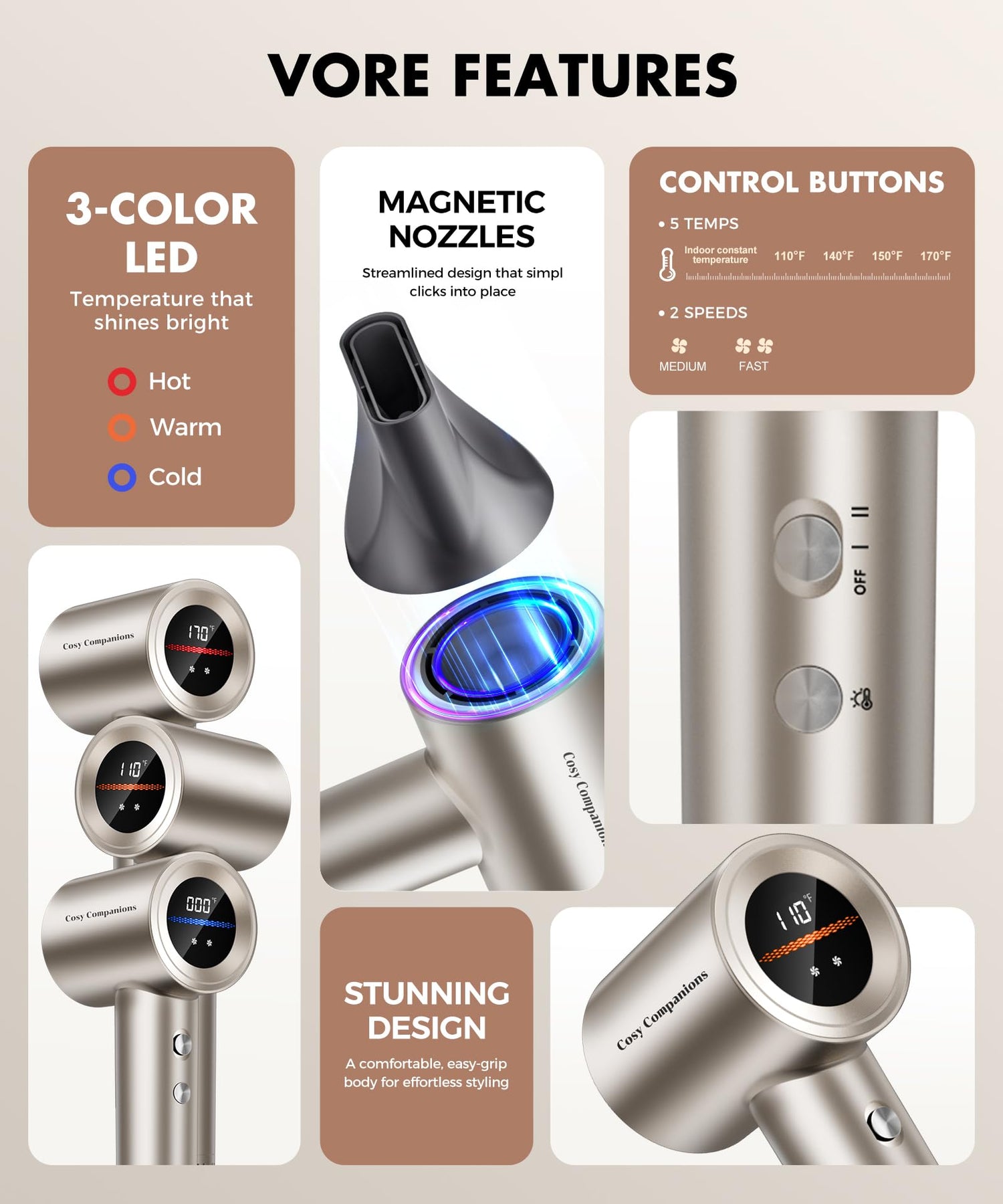 - 500 Times/s Thermo-Control: Cosy Companions ionic hair dryer are equipped with an advanced thermal microprocessor, which is capable of dynamically changing the air temperature over 500 times per second to ensure an even and precise heat output. This dramatically reduces the potential risk of heat damage to your hair, making every blow-drying session a gentle and caring experience