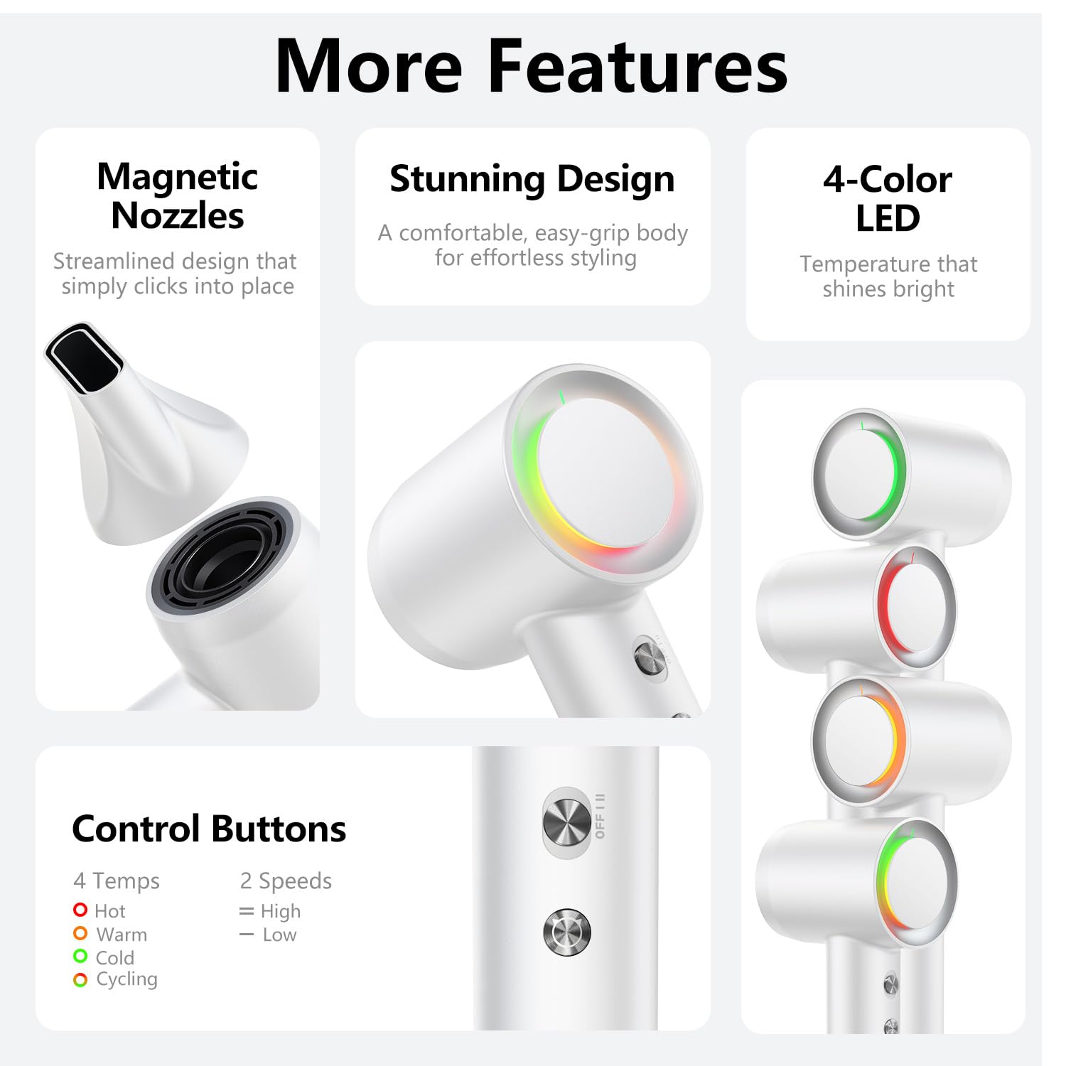 - [Smart Temperature Control] Our hair dryer features an innovative LED ring design that showcases different modes: Red for hot air, Orange for warm air, and Green for cool air. Long-press for alternating hot, warm, and cool air, ideal for all hair types including curly, thick, and fine hair. Additionally, it includes an NTC intelligent temperature control sensor that accurately adjusts the temperature 110 times per second, ensuring a constant temperature to protect your hair from heat damage.