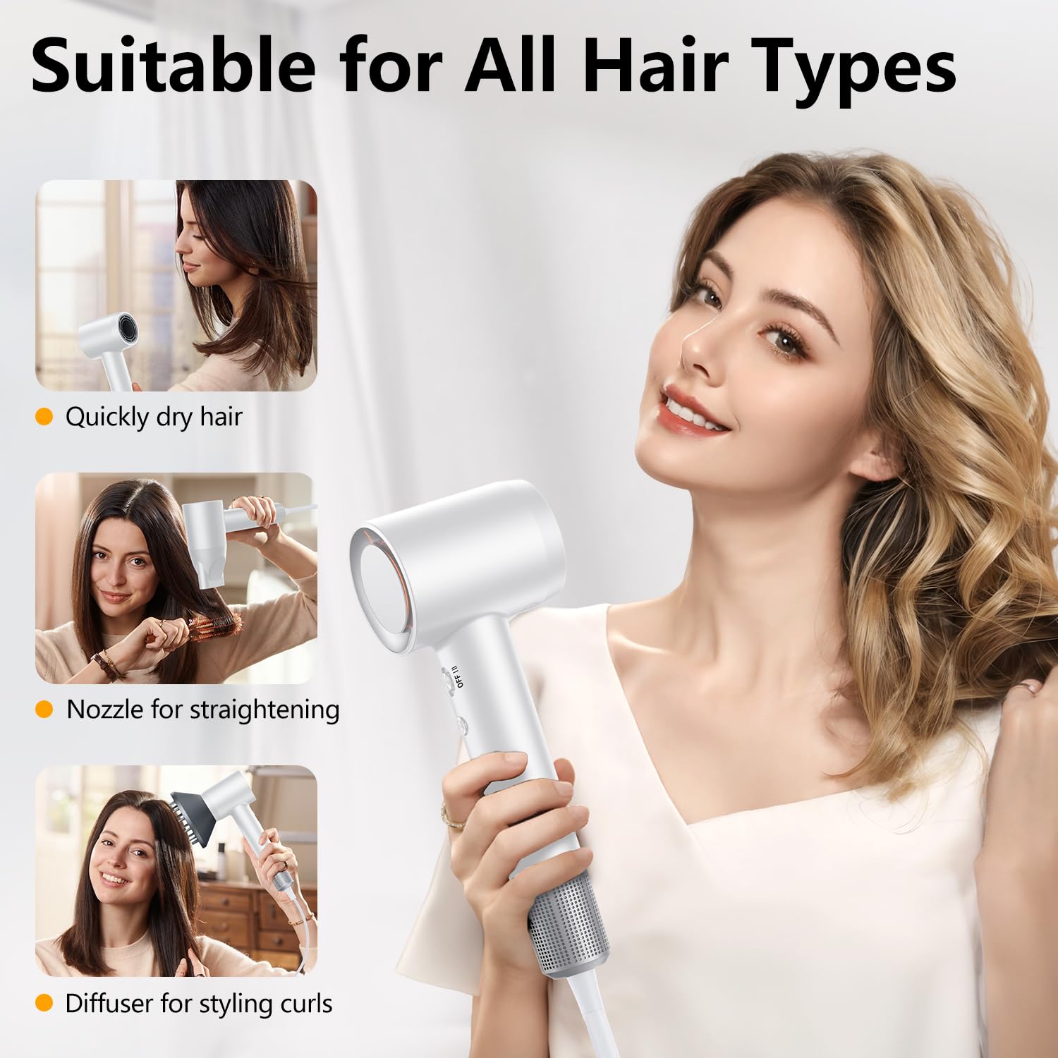 Hair Dryer, 160000 RPM Professional High-Speed Blow Dryer 500 Millions Negative Ionic Care Hair Dryer for Fast Drying, Low Noise Thermo-Control Hairdryer, Travel with Magnetic Diffuser & Nozzle, White