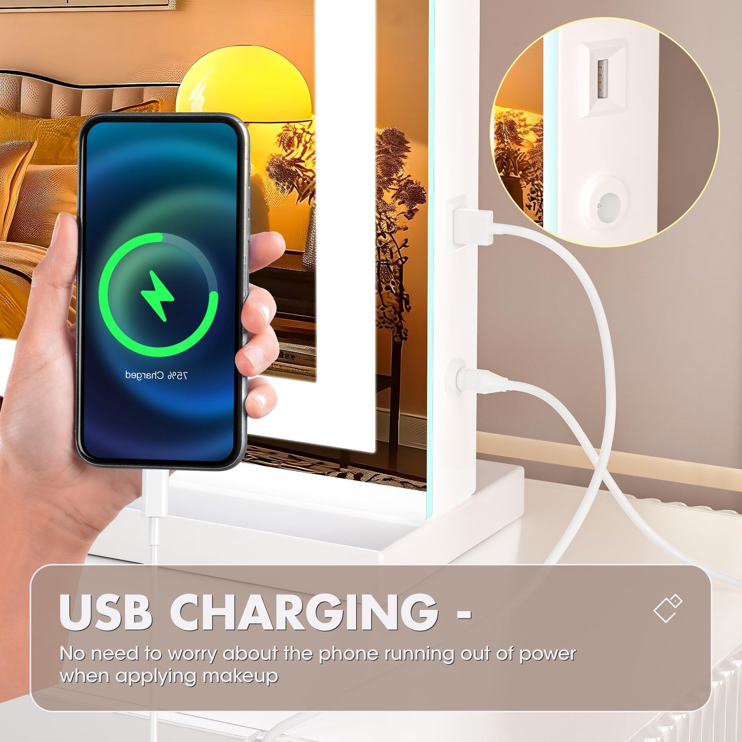 - šćSmart Touch Control & Memory FunctionćThis makeup mirror with lights has 3 smart touch buttons, turn on/off the light by touching the sensor switch, Press left button to change the color modes, long press right button to adjust the led brightness. This lighted makeup mirror is specially designed memory functionfunction keep your lights setting like your last use.