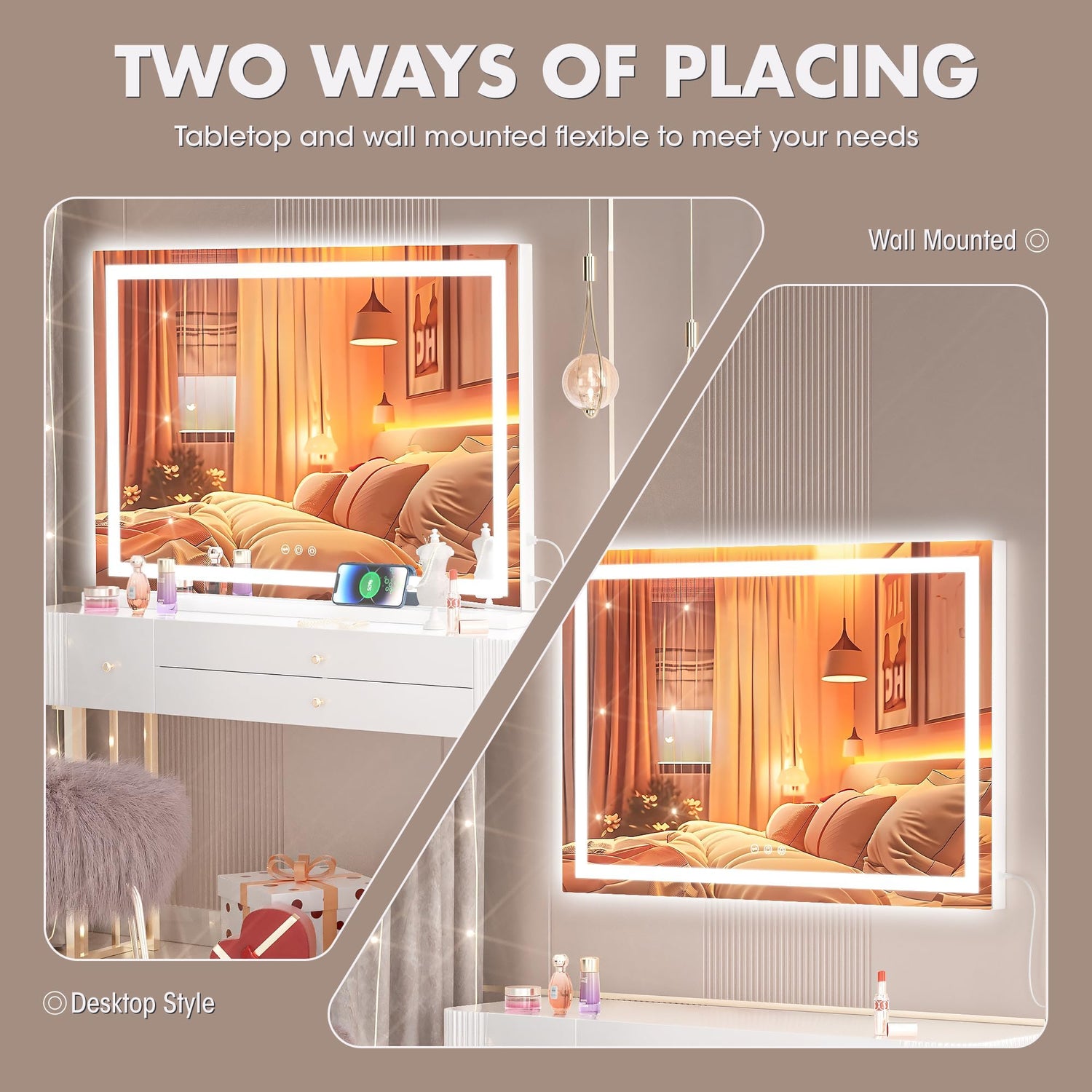 Hasipu Vanity Mirror with Lights, 32" x 20" LED Makeup Mirror, Lighted Makeup Mirror with Dimmable 3 Modes, Touch Screen Control Vanity Mirror Square White