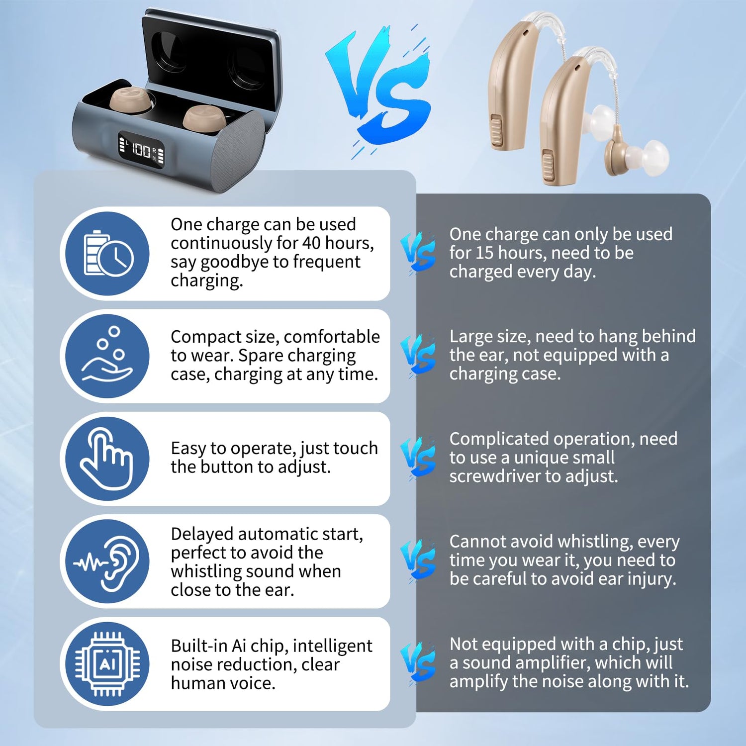 - 【Intelligent Charging Case With Power Display】The rechargeable hearing aid and charging case can be fully charged within 1.5 hours, providing up to 40 hours of continuous use of hearing aids and storing 55 hours of standby power on the charging case, you can wear it all day with confidence. screen on the charging case can clearly show the remaining power, the hearing aids can be charged anytime and anywhere.