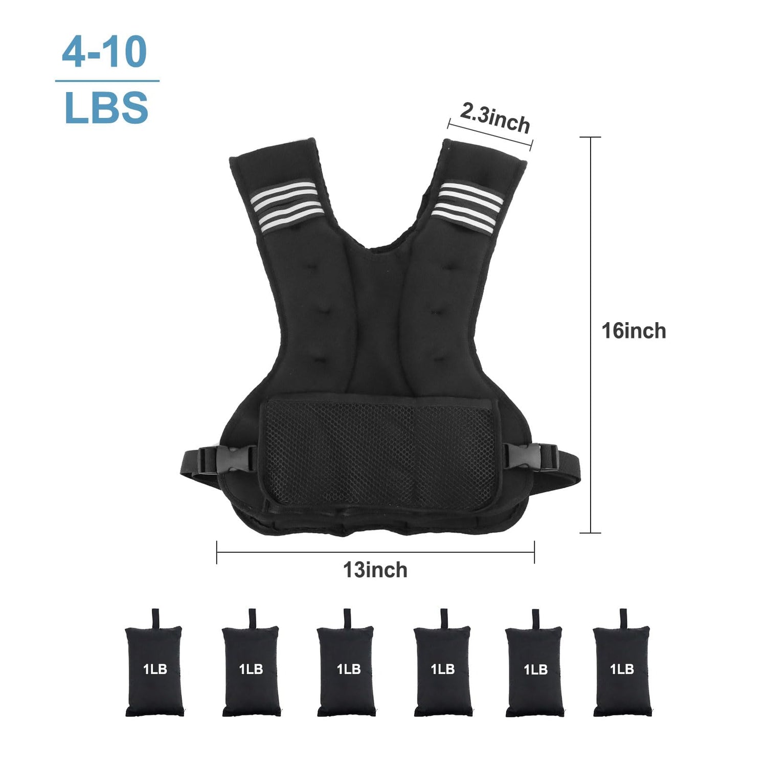 - ADJUSTABLE WEIGHT VEST - This adjustable weighted vest by HENKELION weighs in at 4 pounds by itself but reaches up to 10 thanks to the included six 1LB iron sand weight bags, allowing variable low impact resistance that strengthens your core and endurance no matter your exercise routine