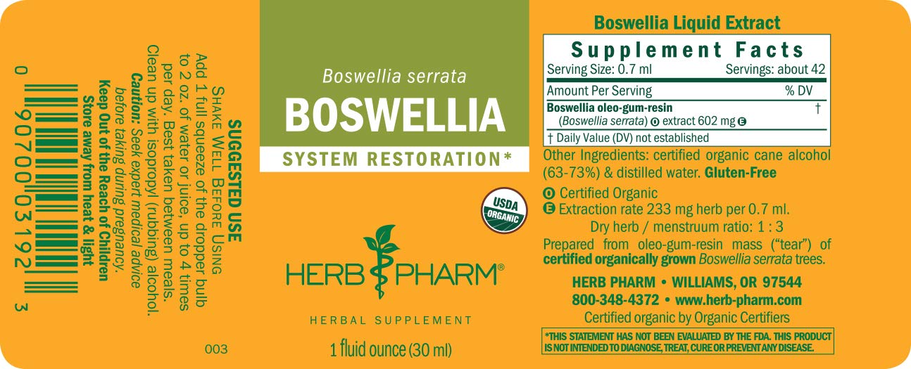 Details: Herb Pharm Boswellia Extract is traditionally used for joint support. Also known as Indian Frankincense, it has been used for hundreds of years by Ayurvedic medicine practitioners. Boswellia is the sustainably wildcrafted resin from Boswellia serrata trees in India. Boswellia is easily dosed and taken in liquid form. It may be added to water or other liquid for taste and is easily absorbed into the bloodstream. Boswellia is very aromatic, almost floral, and somewhat bitter. Herb Pharm never uses synthetic solvents. The company's farm is Certified Organic, Bee Friendly, and Salmon Safe. Herb Pharm is the #1 selling liquid herbal extract brand in US Natural Food (SPINS). Herb Pharm is a company of herbalists, scientists, and farmers in GMO-free Josephine County, OR. There, they have been cultivating herbs with care, precision, and respect for nature since 1979.