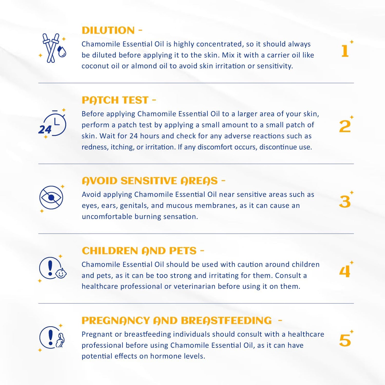 - Body Massage: Dilute 1 drop of chamomile essential oil with 10 to 20 drops of a carrier oil (Sweet Almond, Grapeseed or Jojoba). Take an appropriate amount of the blended oil on your palm and apply the oil in a circular motion on the body parts that need to be massaged, which can relax the body and mind and relieve stress