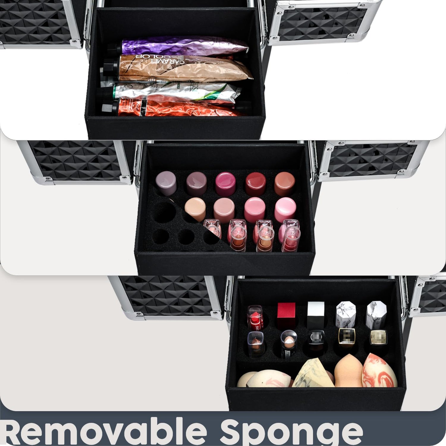 - Multifunctional Slide Rail Trays: The slide rail expands smoothly, does not slide out when not in use, and is firmly connected. The 3 trays helps you organize makeup tools, lipstick collections, palettes, and makeup brushes. The separate trough tray has a removable sponge that can hold nail polish upright or store lotion jars with the sponge removed.