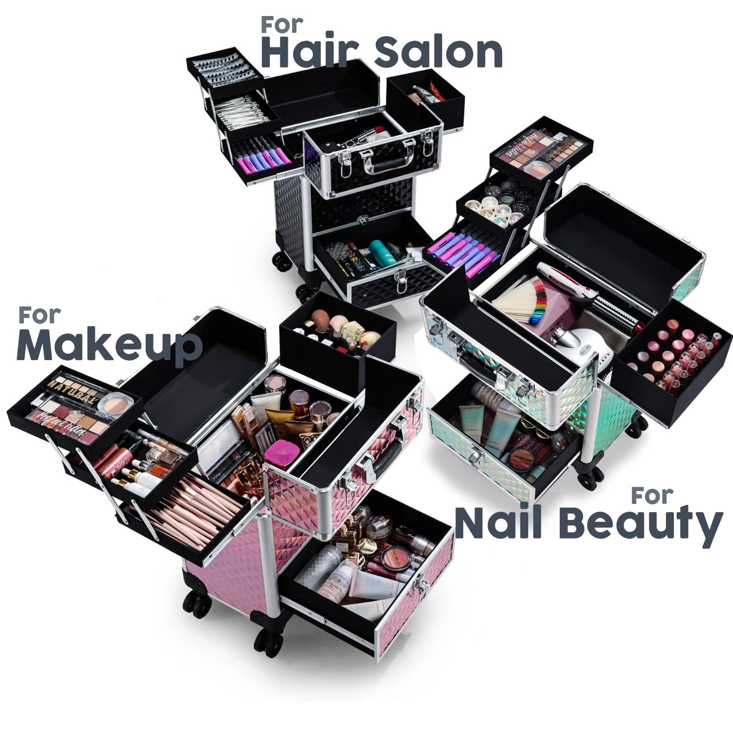 - Sturdy Rolling Makeup Case: Grade-A aluminum and metal reinforced edges and corner has great performance in abrasion resistance and is characterized by its lightweight and durability. Aluminum pull rods provide smooth operation and corrosion resistance as well. The waterproof black surface makes this makeup trolley case an excellent protector for outdoor cosmetics.