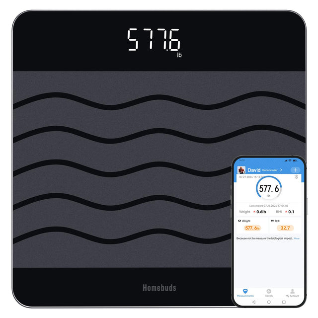 Homebuds 600lb Digital Bathroom Scale for Body Weight and BMI Via Smart APP, High Accuracy in 0.1lb Assured by Weighing Professional Since 2001, 8mm Tempered Glass, Extra Large LED Display, Black is backordered and will ship as soon as it is back in stock.