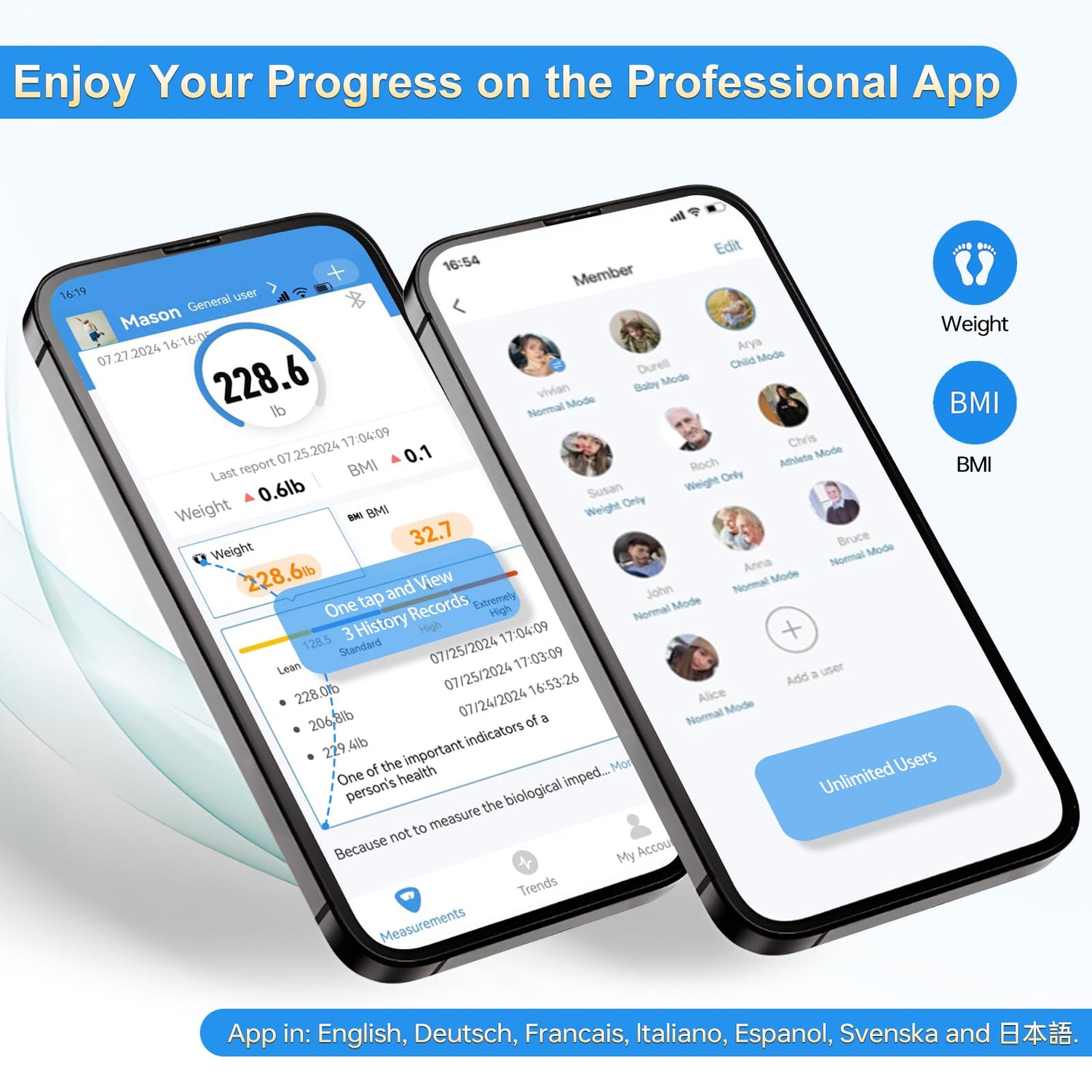 - EASY SETUP AND SERIOUS PRIVACY - Our app for smart bathroom scale is super convenient to create unlimited users for family and friends. And weighing numbers and BMI showed and stored in our ease-to-use APP through at-a-glance dashboard. What is more, all user data of our professional App is secured and stored in US and EU Cloud Server via AWS( Amazon Web Services). We protect your personal PRIVACY by best-in-class standard.