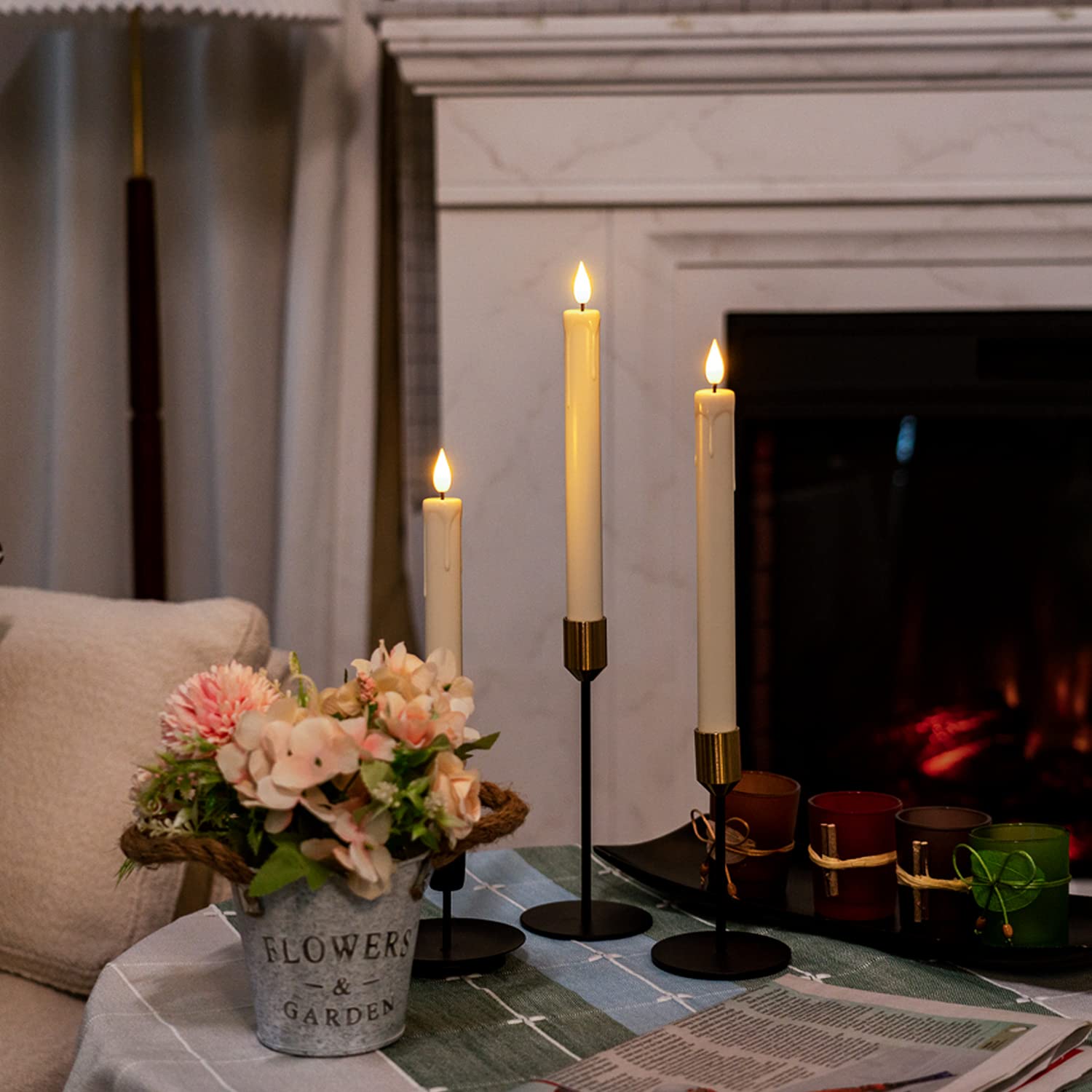 - Lifelike Plastic Made: These realistic flameless taper candles are made of wax-looked modulated plastic, unmelted, won't crack, and won't degrade over time, decorated with melted dripping wax beneath the flame, perfectly simulate real burning taper candles.
