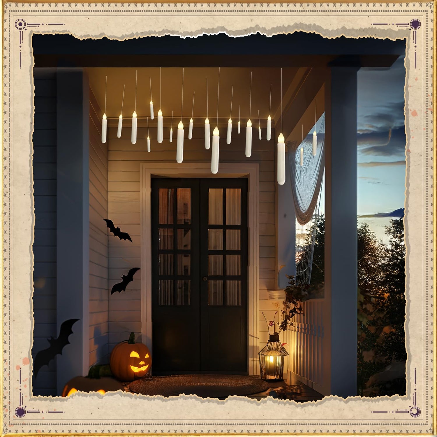 - Never received a letter from magic school? but it doesn't matter! You will receive 20 pcs hanging floating candles, an easy hanging kit with 2 wand remote range of 45 ft/10 meters which can switch these flickering flameless taper candles on and off simultaneously just like magic. Set these candles in your house, and with just one click, together with some spells and movements, you are a witch!