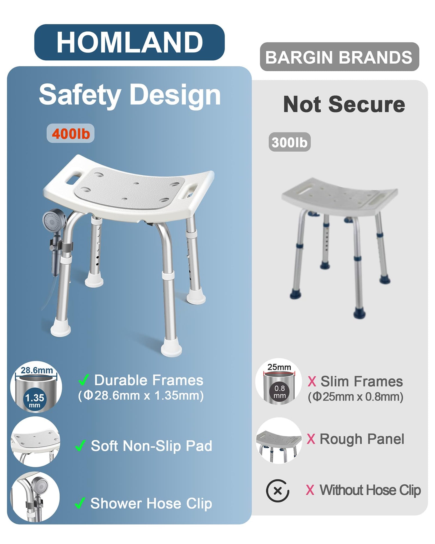 - 【400lbs Durable Shower Chair】HOMLAND bath chair made with reinforced aluminum alloy frames, provided max strength up to 400lbs. Recommended user weight 300lbs. Bath bench dimensions: Width: 17 Inches x Length: 10.5 Inches