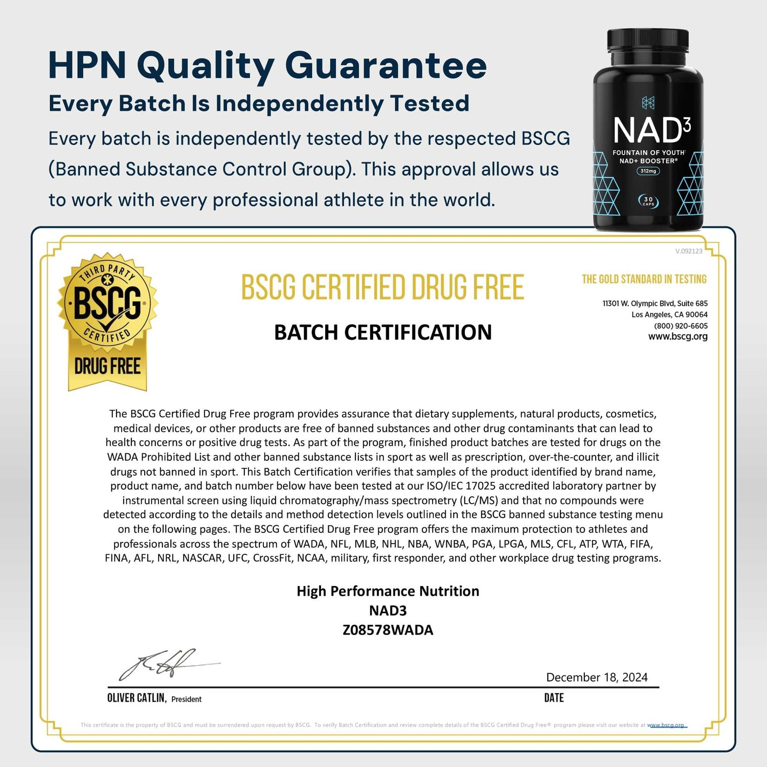 - INDEPENDENTLY TESTED BY THE BSCG - NAD(3) is made in the USA with NSF cGMP certified manufacturing and independently tested for guaranteed purity and quality with every bottle