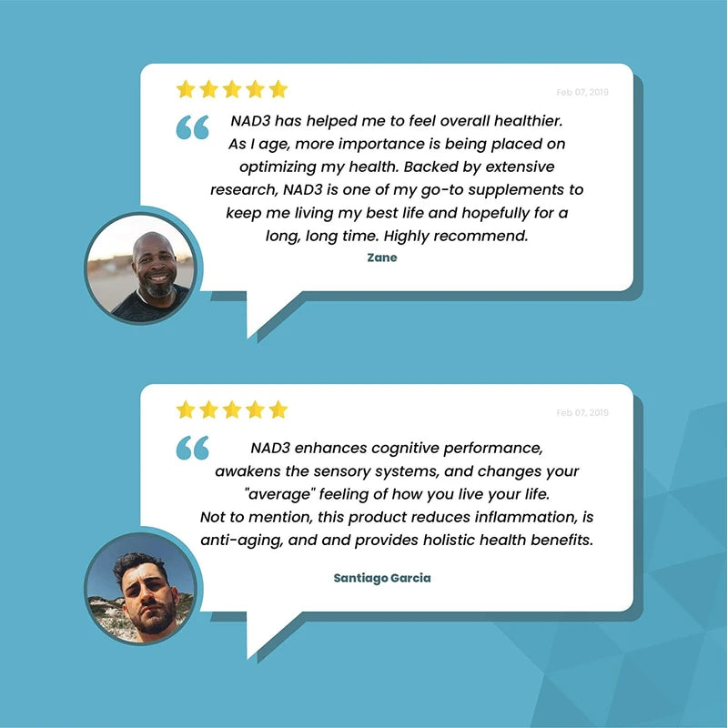 - NAD3 impacts all the key areas of cell health: NAD levels, sirtuin activity, telomerase function, and inflammation reduction