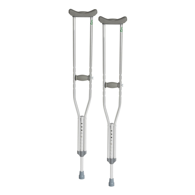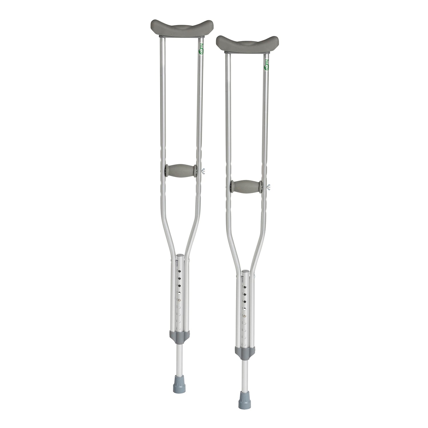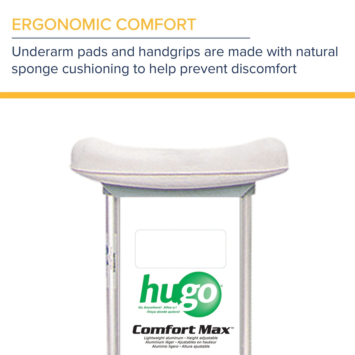 Details: Hugo Crutches are lighter than wood and are made of lightweight anodized aluminum, supporting up to 300 lbs. These adult-sized adjustable crutches can accommodate a user of 5’ 2” to 5’ 10” (62 to 70 inches). Collapsible crutches feature dual push-button adjustments, while approximate patient height settings are labeled on the center tube within 1” increments. Contoured crutch tips feature a curved stair deflector at their tip, provide exceptional traction while a built-in metal ring protects against premature wear. The walking crutch features thick cushioned crutches pads designed with internal ribbing and reinforced ends that reduce pressure and underarm fatigue. Made from a natural sponge cushioning that absorbs impact shock and is perspiration resistant.