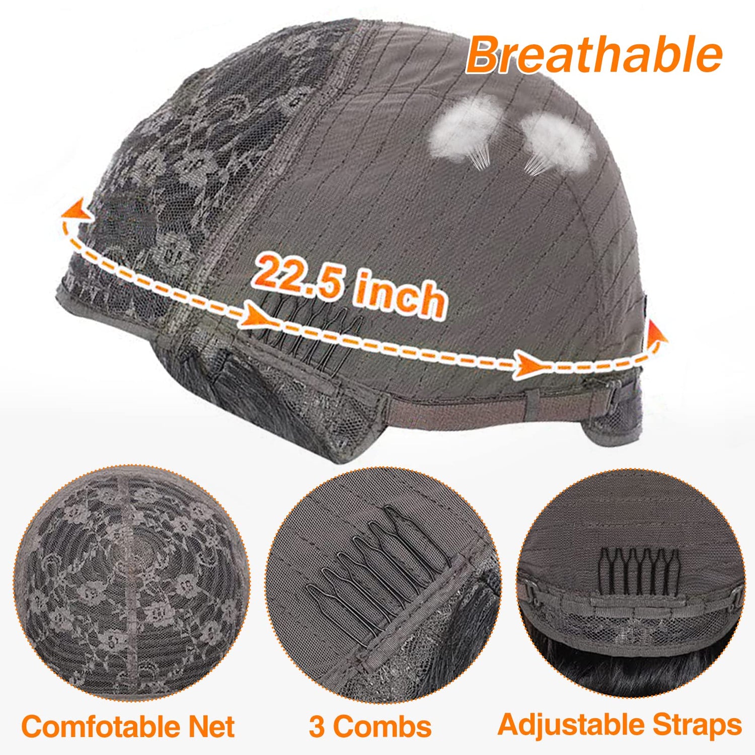 - Cap Size: Medium Cap 22-22.5 Inch (Average Cap Size). Breathable Net Cap, with Three Combs and Adjustable Straps for Different Head Sizes