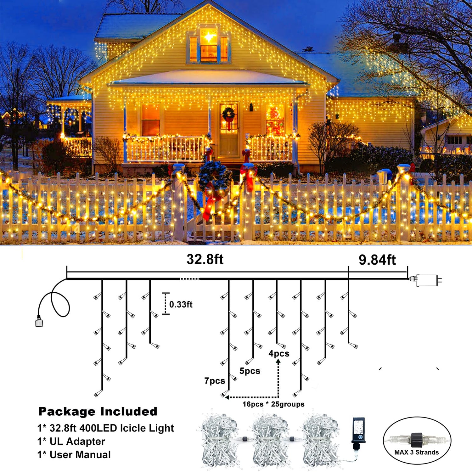 - 【Connectable Icicle Christmas Lights】The XmasBokeh Christmas lights feature 400 LEDs arranged across 75 hanging drops, with clusters of 4, 5, and 7 LEDs. The total length of the string of lights is 33 feet with an additional 10 feet of leading wire, they effortlessly reach areas like your bedroom or yard. Moreover, you can connect up to 3 sets end to end, making them perfect for decorating expansive spaces.