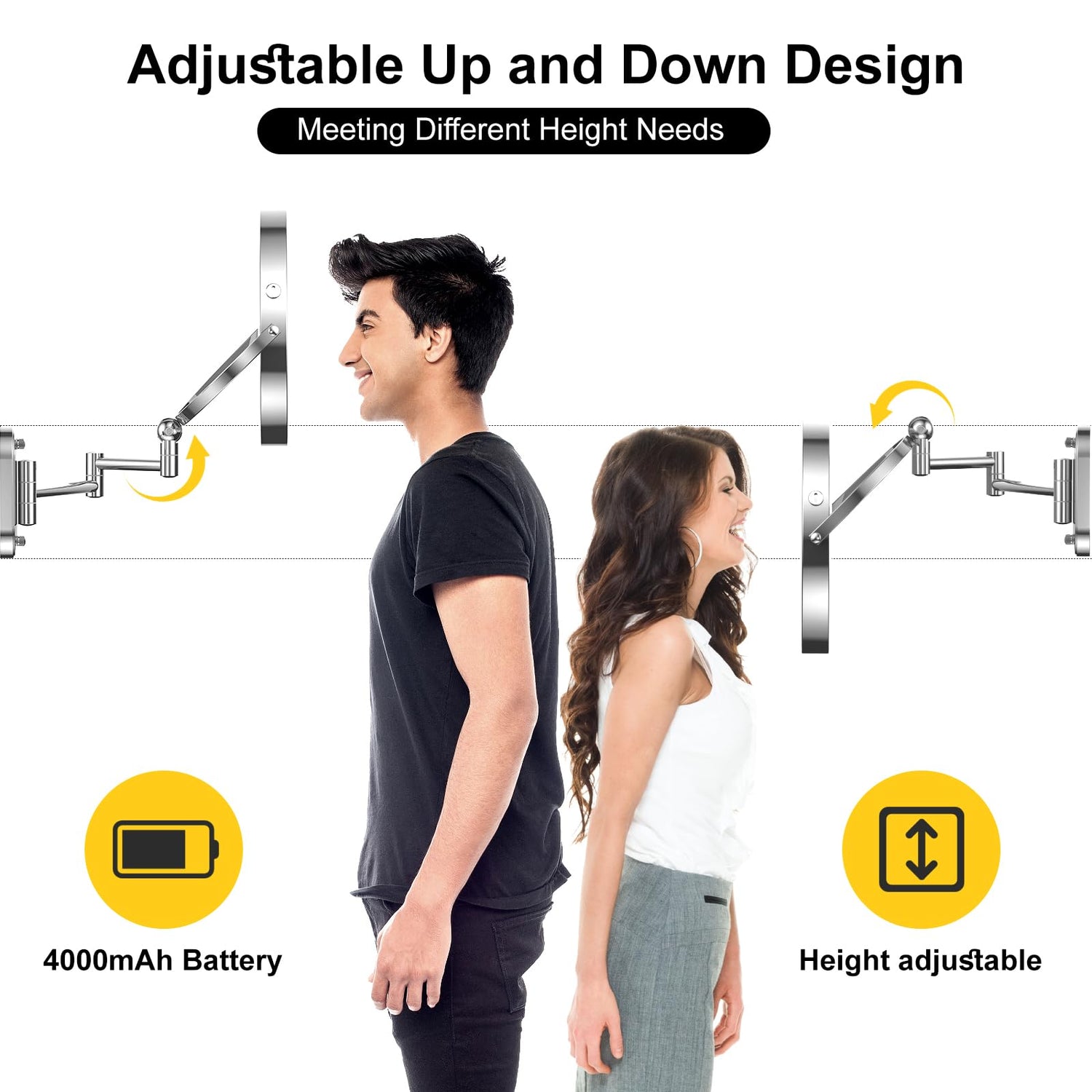 - 360°Rotation & Extendable Arm Makeup Mirror: The multiple joints of the wall-mounted makeup mirror with retractable arm allows you to fix the mirror in the best position and adjust the arm to any angle you need to achieve perfect viewing.The flexible mirror arm can be freely extended so that the magnifying mirror can be adjusted to the right viewing angle and distance, allowing you to freely apply makeup,shaving or wearing contact lenses, etc. You can fold the mirror on the wall to save space when you are not using it.