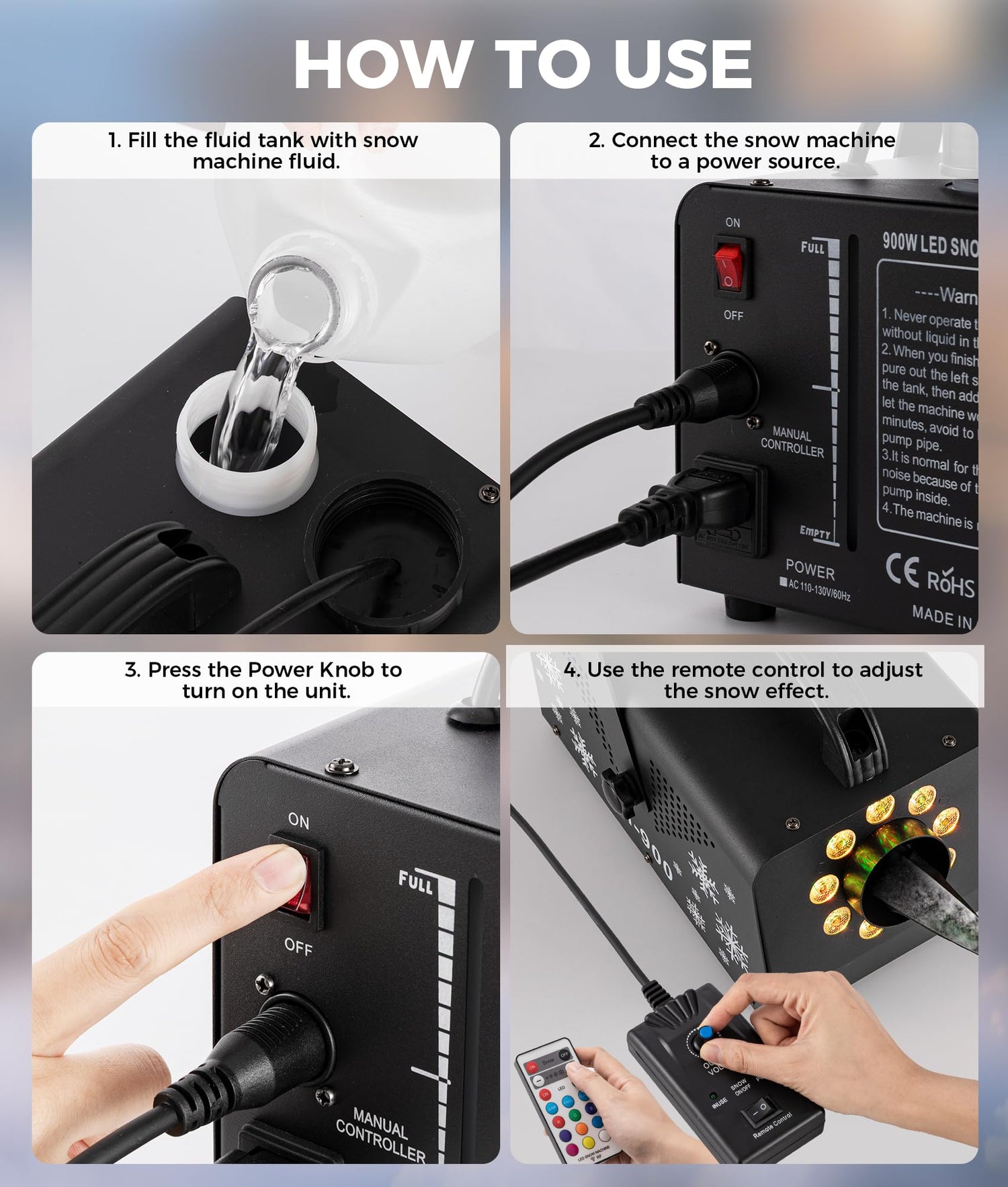 - 【Non-Toxic & 1000ml Large Tank Snow Machine Long Lasting】900w Power christmas snow machine with colorful lights,the output power reaches to around 3000 CFM(Cubic Feet per Minute) at 13-17 feet (4-5 meters) distance to create a romantic snow scene for all year round. You can use IMONE snow blower machine with confidence because it does not produce any toxic gas. FCC, CE and ROHS certified for safe production. 1000ml tank ensures long lasting snow production