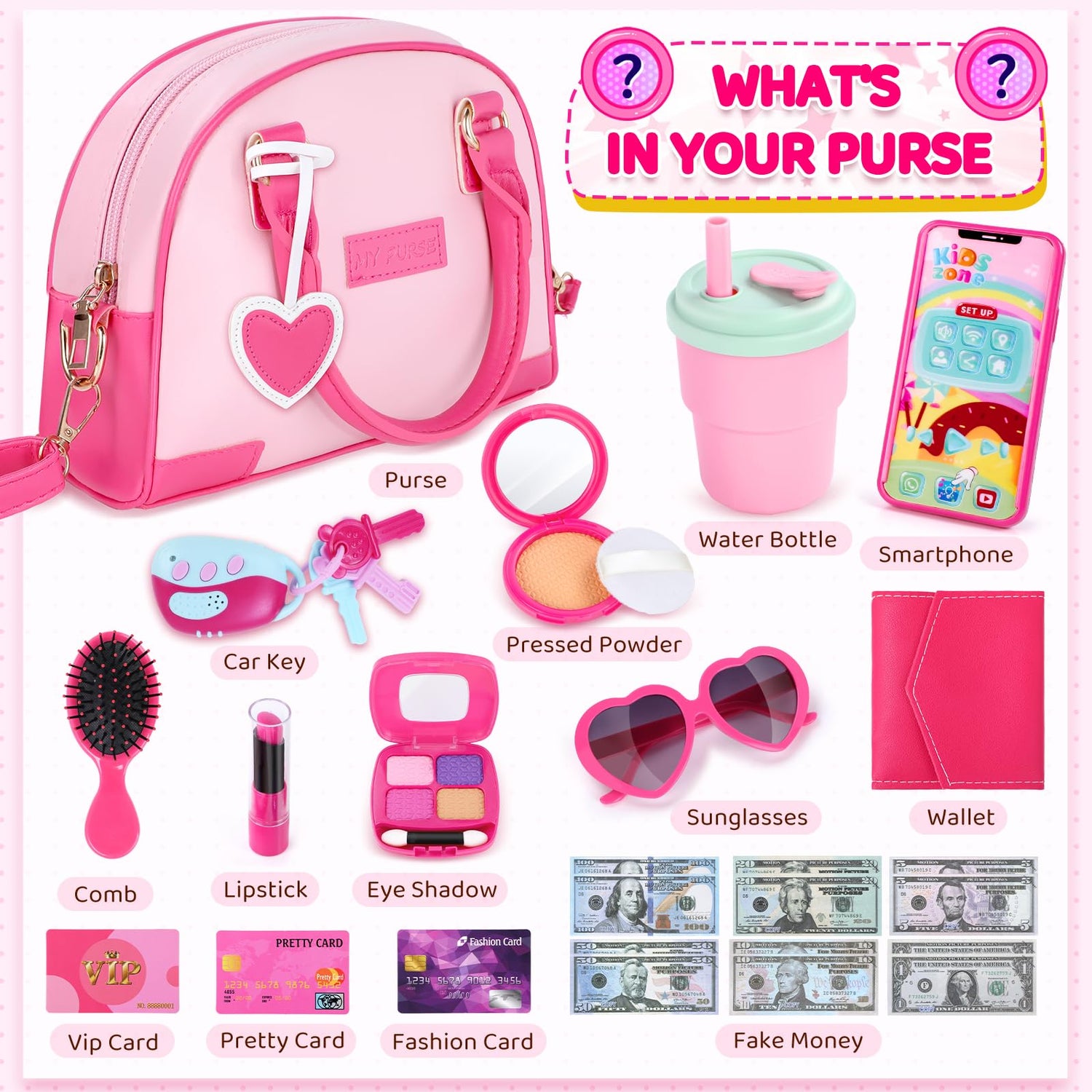 - 28 IN 1 SUPER VALUE KIDS PURSES FOR GIRLS - Our little girl purses set includes Pink Purse x 1, Water Bottle x 1, Toy Phone x 1, Car Key x 1, Wallet x 1, Fake Money x 14, Credit Card x 3, Lipstick x 1, Eyeshadow x 1, Powder x 1, Powder Puff x 1, Hairbrush x 1. This toddler purses playset satisfies the little girl's curiosity and desire for imitation, your little princess will love them because they are so lovely. The purse for teen girls can create hours of fun playtime for your little princess.