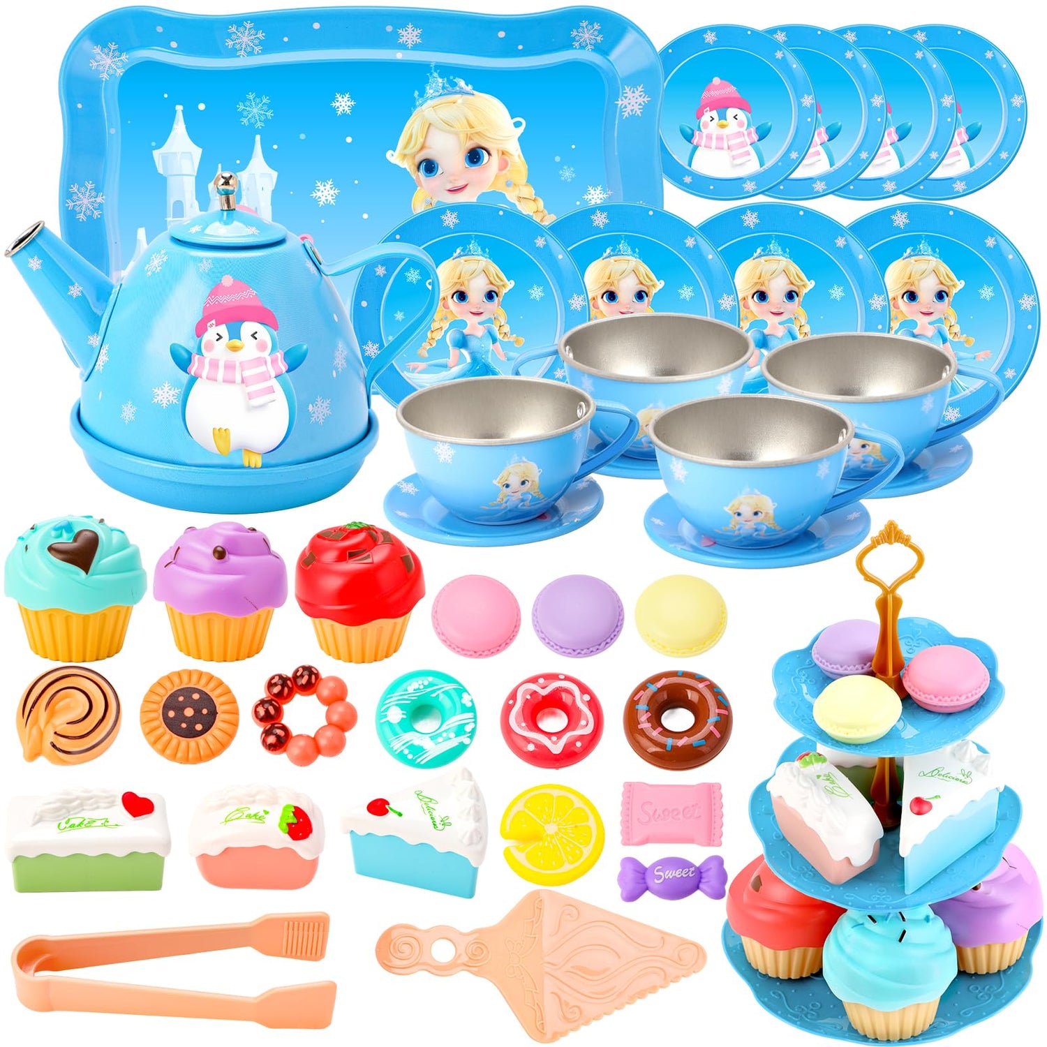 - ❄️BEST VALUE TOYS FOR GIRLS - INNOCHEER tea party set includes Cute Princess Toy Box X 1, Teapot X 1, Serving Tray X 1, Teacup X 4, Coaster X 4, Plate X 4, Cake Stand X 1, Cake X 6, Macaron X 3, Donut X 3, Cookie X 3, Candy X 2, Lemon X 1, Cake Spatula X 1, Food Tongs x 1. This charming tea set for girls 6-8 includes everything your child needs to host a fabulous tea party.