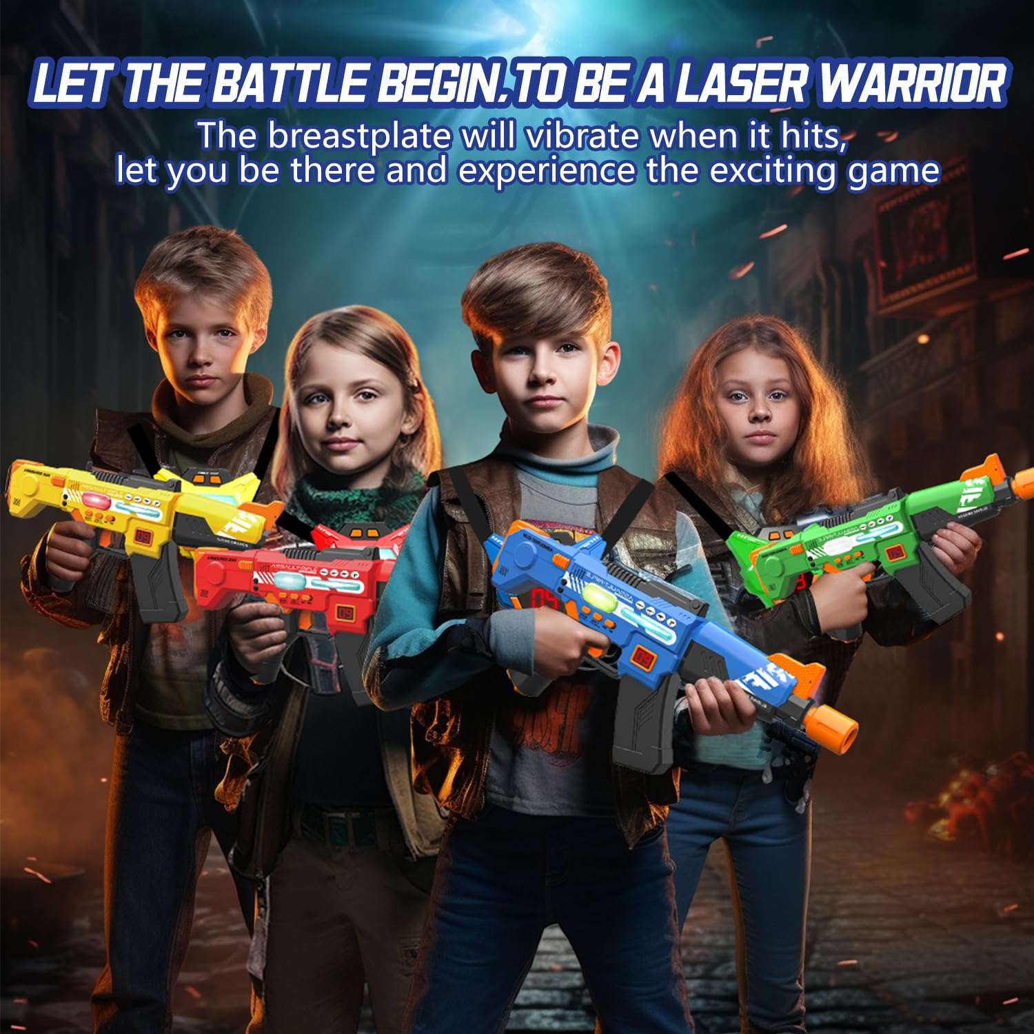 - 【Brand New Rechargeable Laser Tag Set】We are committed to exploring better interactivity gaming experience and more suitable for kids grip and use.Now this upgraded laser tag submachine guns set of 4 is the best choice for your kids and family.The package contains 4pcs laser guns & 4pcs LED digital multi-functional vests also equipped with 2-in-1 USB charging cable,no more hassle of changing batteries,just enjoy over 8-9 hours playtime after get charging 1-1.5 hrs.