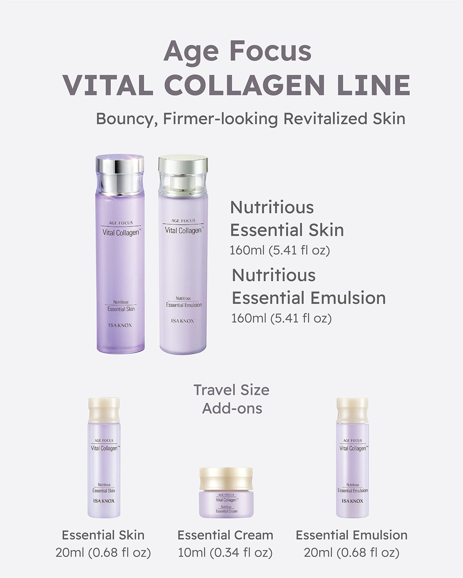 - AGE FOCUS VITAL COLLAGEN SKINCARE SET - Collagen Essential Skin Toner (5.41 fl oz & 0.68 fl oz), Collagen Essential Emulsion (5.41 fl oz & 0.68 fl oz), and Collagen Hydra Gel Cream (0.34 fl oz)
