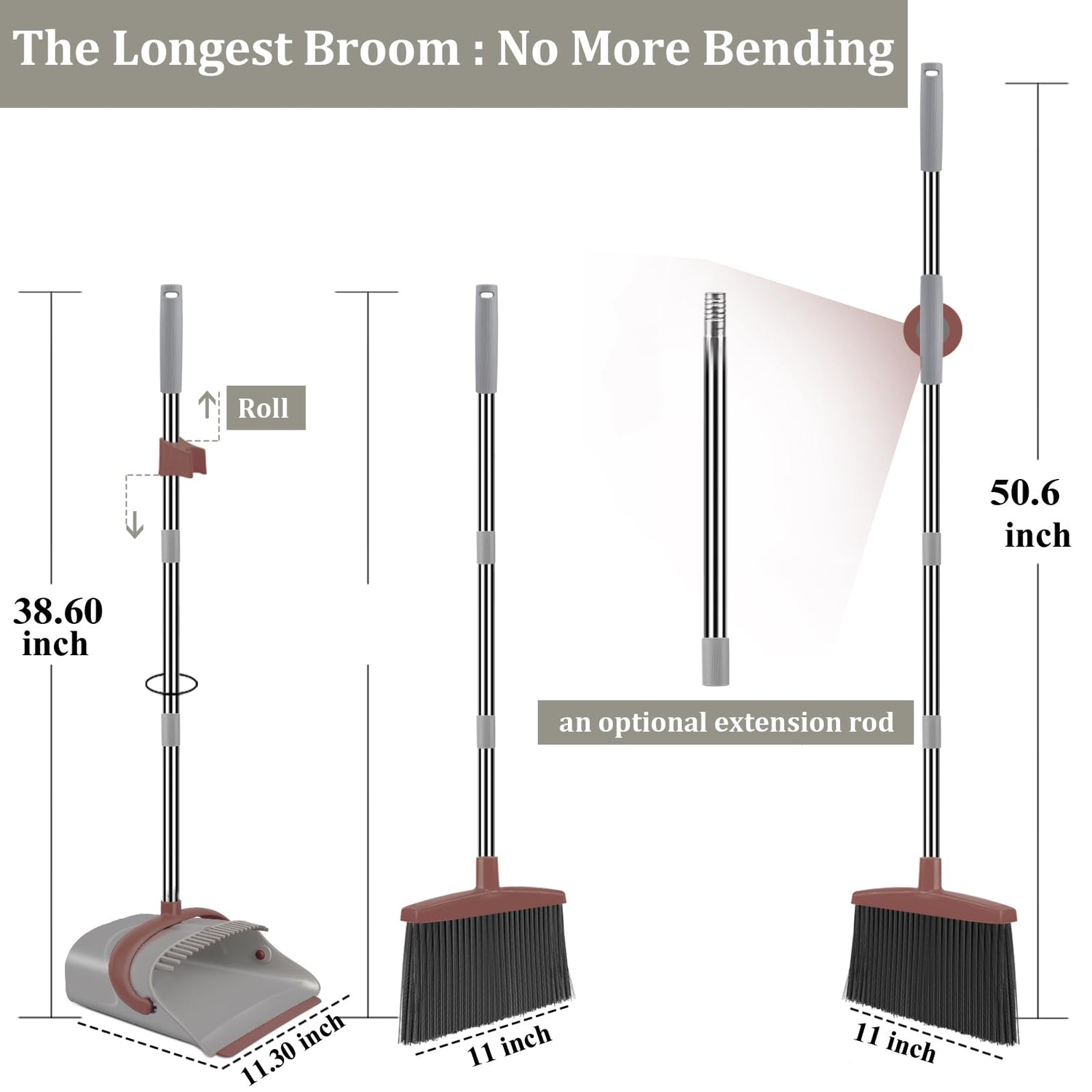 - No Bending Clean Up: Broom and Dustpan, Adjustable handles with room for variety based on your needs offer comfortable sweeping without having to bend over. Sturdy construction and rustproof material