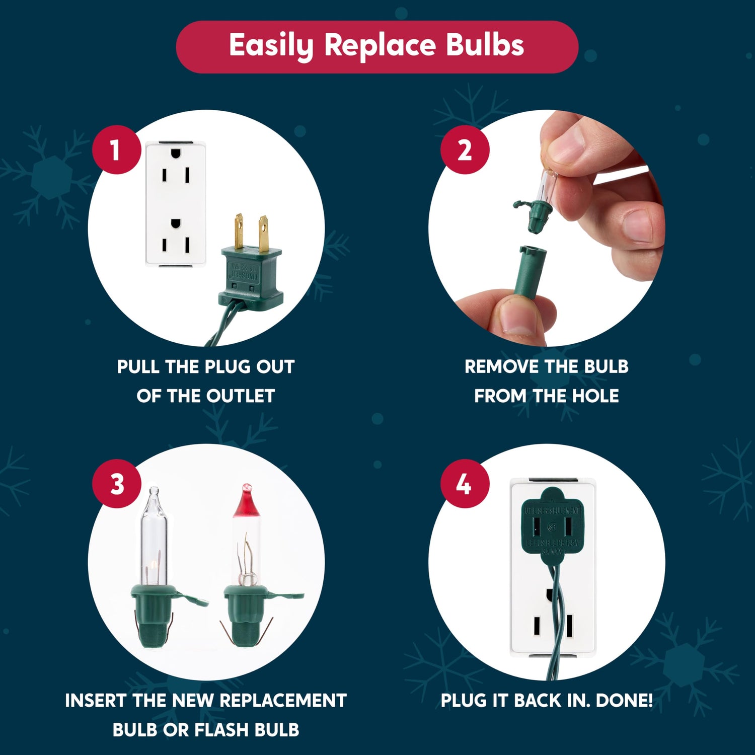 - INDEPENDENT CIRCUIT & REPLACEMENT BULBS - Enjoy a hassle-free holiday! Our lights feature an independent circuit system; if one bulb burns out, the rest stay lit. The set includes 8 spare bulbs, 4 replacement fuse, and 8 test flash bulbs., ensuring your display stays bright throughout the season without needing a full replacement.