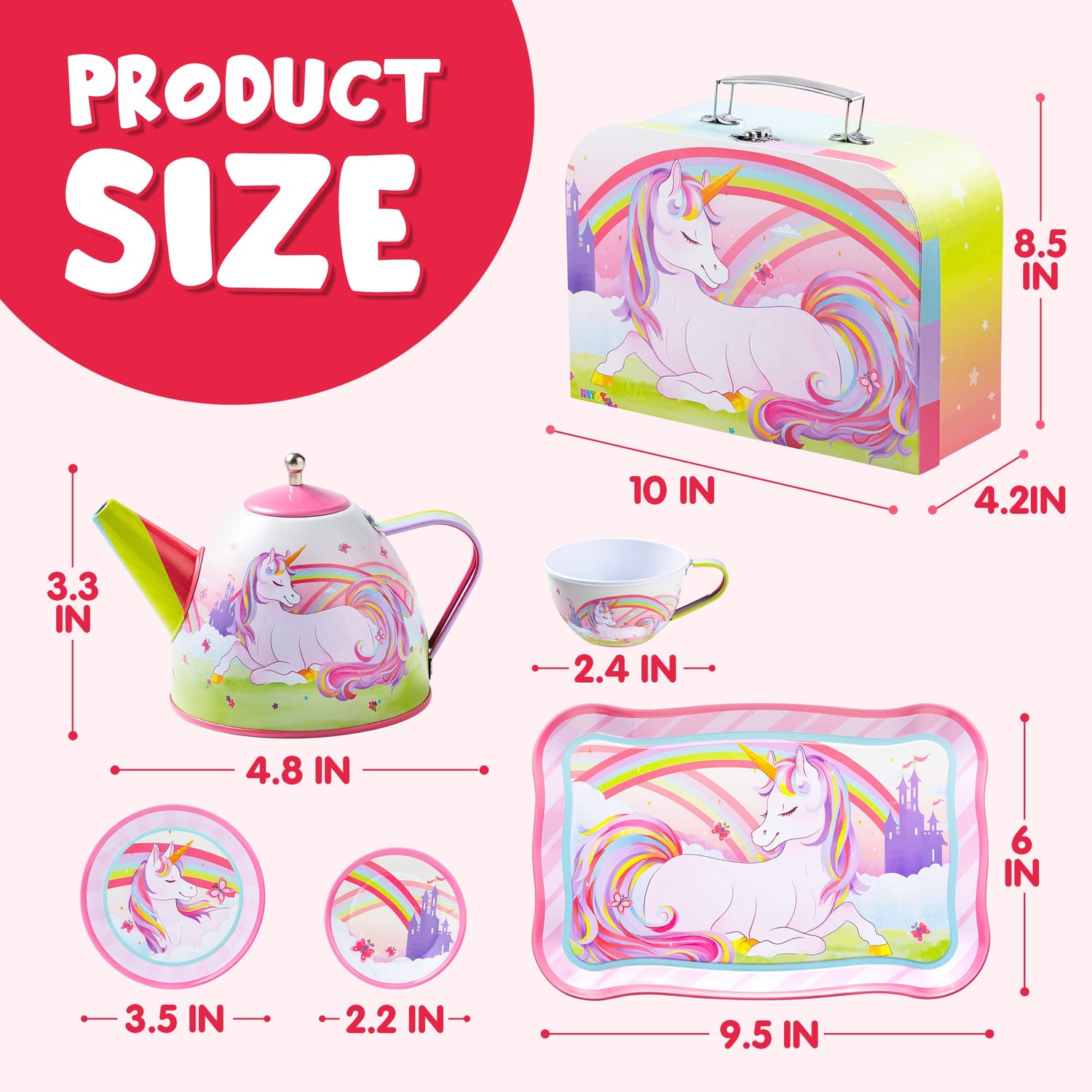 - REAL FUNCTION. This adorable toy tin set is designed for pretend role play, encouraging children to use their imagination and improve their creativity and social skills. The tea set is decorated with a magical unicorn , rainbow, and other delightful castle. Sure to delight and inspire your little tiny unicorns.