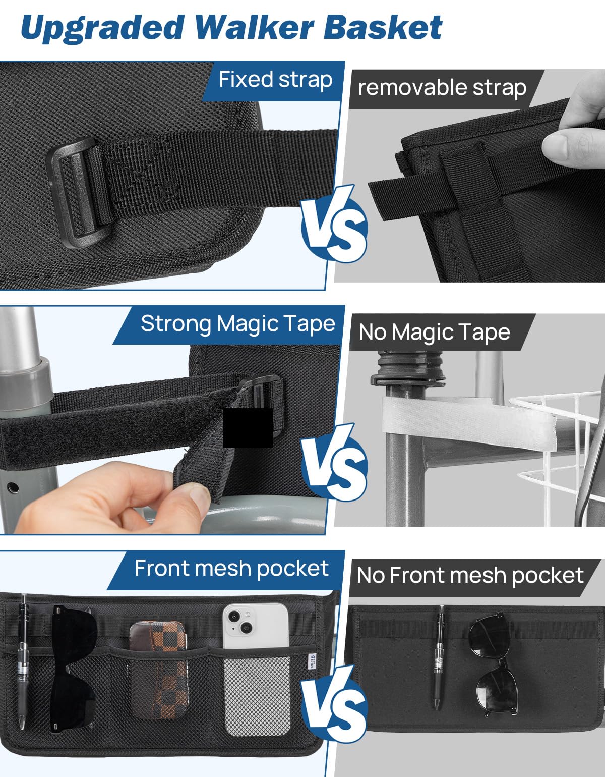 - [Sturdy & Never Collapses]: 5 Strengthen velcro straps with buckle help you install to your walker easily and be secured tight. Besides, the balanced design can ensure that it will never be tipping over the walker! It's very useful for carrying things from the kitchen to other rooms of the house