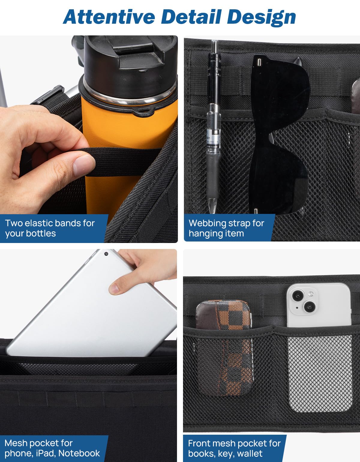 - [Upgrade Design]: We added two front mesh pocket, which can store your phone, iPad, Notebook. Also two side net pockets and two elastic bands for storing your bottles, drinks, drugs, and umbrella, keep your drinks secure without spilling, the webbing strap for hanging item