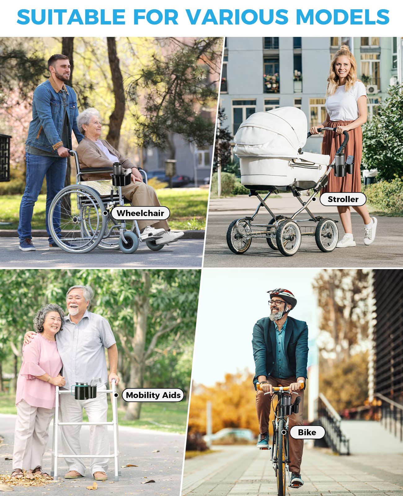 - 【Universal Cup Holder】: The multifunctional cup holder could be used not only for strollers but also rollators, wheelchairs, scooters, camping chairs, airport chairs, lounge chairs, lawnmowers, boats, kayaks, tractors, cruisers, etc. It is Suitable for 0.6-1.5 inch poles. And it also fits different sizes of bottles, like baby bottles, water bottles, coffee mugs, etc