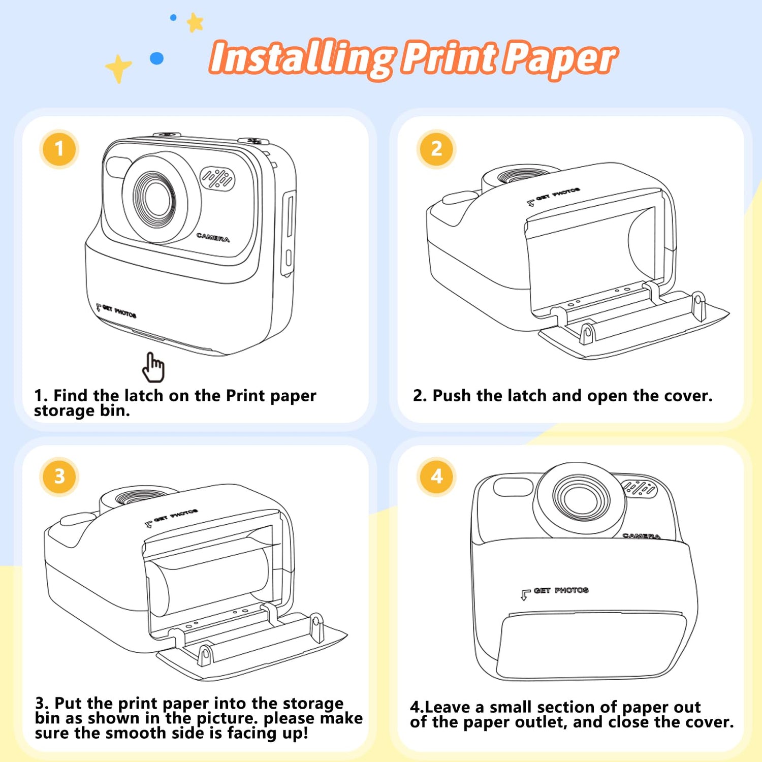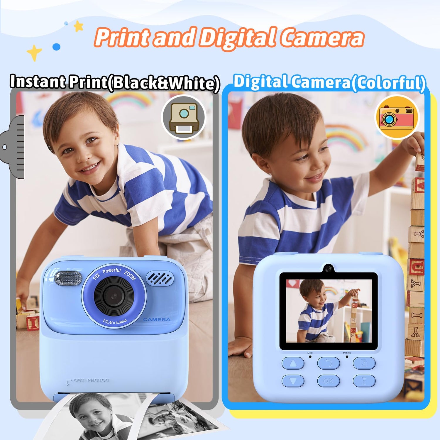 - 【Creative Instant Print Camera Special Designed for Kids】This kids digital camera with an instant printing function, you can obtain color photos store in SD Card while quickly printing black and white photos, our kids cameras are equipped with 2 print modes, grayscale and dot matrix printing, and 3 types of color depth printing. With Advanced thermal printing technology, no toner and BPA, it is very safe to kids. It helps Recording your child's happy growth, develop kids imagination and creativity, enhance the fun of parent-child interaction.