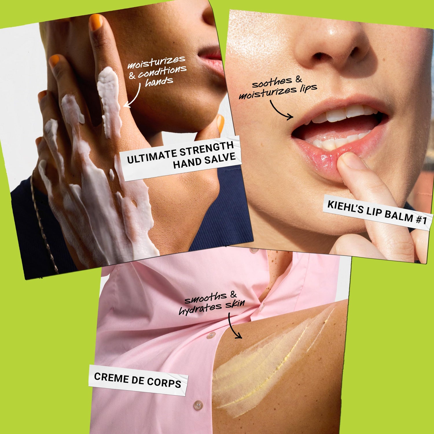 - A collection of three hydrating body care formulas including our luxurious non-greasy body lotion, conditioning hand salve for dry hands, and moisturizing lip balm for smoothing and softening the entire body.