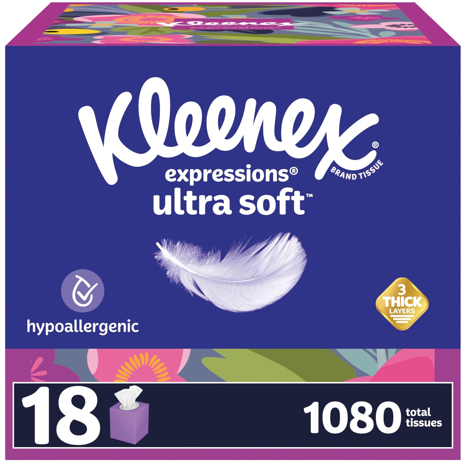 Details: Tissues may be soft, but there’s only one Kleenex Expressions Ultra Soft—made with three thick layers for a perfect balance of softness and strength. Whether it's for cold and flu season, pollen allergies, or everything in between you'll have plenty for everyone with Kleenex Expressions Ultra Soft with 18 cube boxes of 60 ultra soft tissues. Designed for runny noses and watery eyes, our lotion-free and dye-free tissues have no added fragrance and feature soft, strong and absorbent care for face and hands. Plus, you can find a tissue box that’s attractive for your home in various colors and designs. 100% of our pulp is from responsibly managed forests. Want to nourish your skin? Try Kleenex Soothing Lotion Facial Tissues with Coconut Oil, Aloe and Vitamin E.