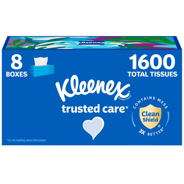 - WHAT'S INCLUDED — 8 flat boxes of Kleenex Trusted Care Facial Tissues, 2-Ply, 200 tissues per box (1,600 tissues total)